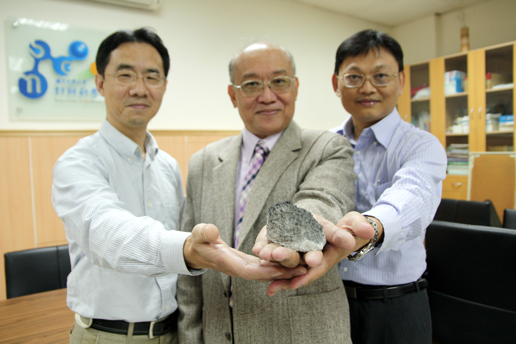 興大材料系曾文甲教授、吳威德主任與汪俊延教授(左至右)成功研發爐渣(手持物)回收再利用技術 |