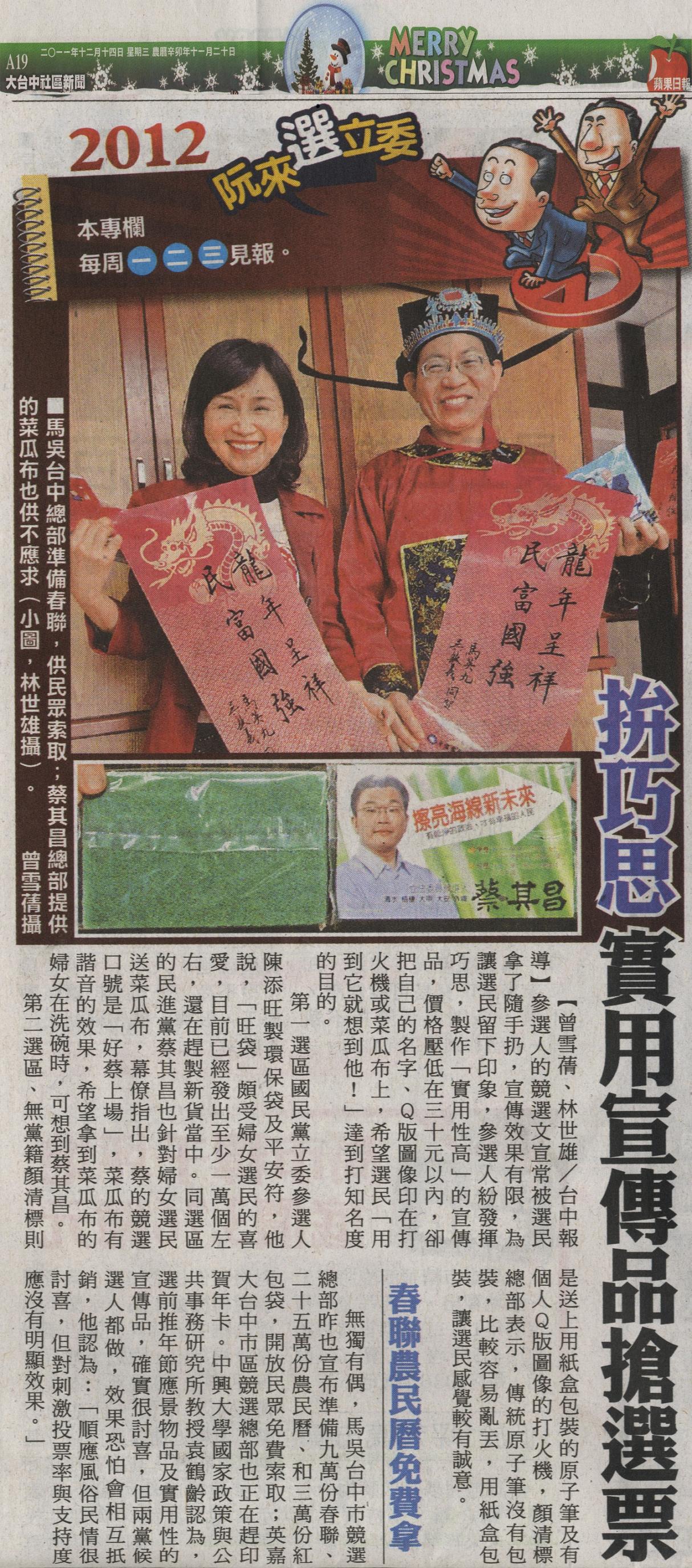 無獨有偶,馬吳台中市競選總部昨也宣布準備九萬份春聯、二十五萬份農民曆、和三萬份紅包袋,開放民眾免費索取;英嘉大台中市區競選總部也正在趕印賀年卡。中興大學國家政策與公共事務研究所教授袁鶴齡認為,選前推年節應景物品及實用性的宣傳品,確實很討喜,但兩黨候選人都做,效果恐怕會相互扺銷,他認為:「順應風俗民情很討喜,但對刺激投票率與支持度應沒有明顯效果。」