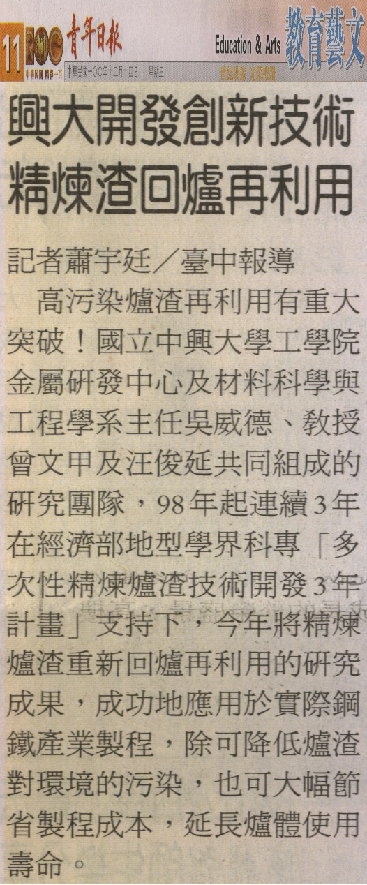 高污染爐渣再利用有重大突破!國立中興大學工學院金屬研發中心及材料科學與工程學系主任吳威德、教授曾文甲及汪俊延共同組成的研究團隊,98年起連續3年在經濟部地型學界科專「多次性精煉爐渣技術開發3年計畫」支持下,今年將精煉爐渣重新回爐再利用的研究成果,成功地應用於實際鋼鐵產業製程,除可降低爐渣對環境的污染,也可大幅節省製程成本,延長爐體使用壽命。