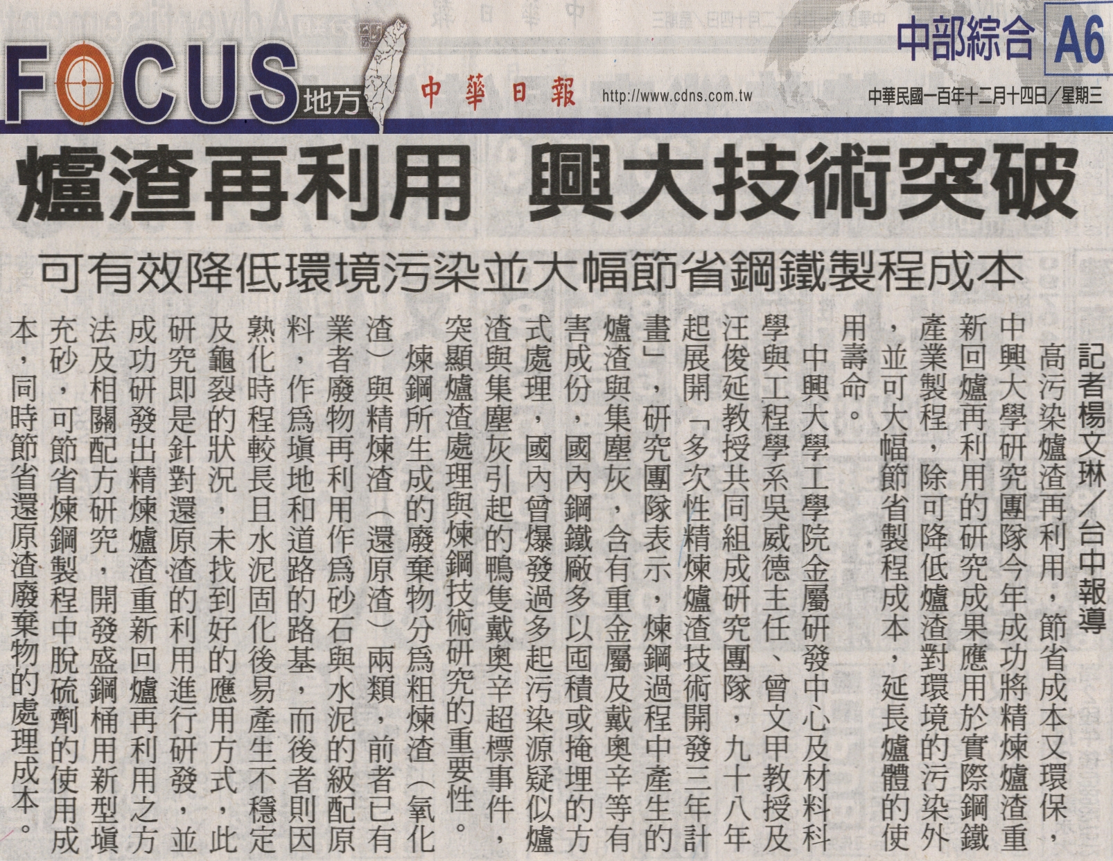 中興大學工學院金屬研發中心及材料科學與工程學系吳威德主任、曾文甲教授及汪俊延教授共同組成研究團隊,九十八年起展開「多次性精煉爐渣技術開發三年計畫」,研究團隊表示,煉鋼過程中產生的爐渣與集塵灰,含有重金屬及戴奧辛等有害成份,國內鋼鐵廠多以囤積或掩埋的方式處理,國內曾爆發過多起污染源疑似爐渣與集塵灰引起的鴨隻戴奧辛超標事件,突顯爐渣處理與煉鋼技術研究的重要性。