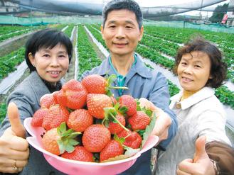 新竹縣芎林鄉農民曾榮來(中)、彭燕惠(右)夫婦種植的香水草莓果粒大又甜,芎林農會總幹事林冠伶(左)吃過後讚不絕口。 |