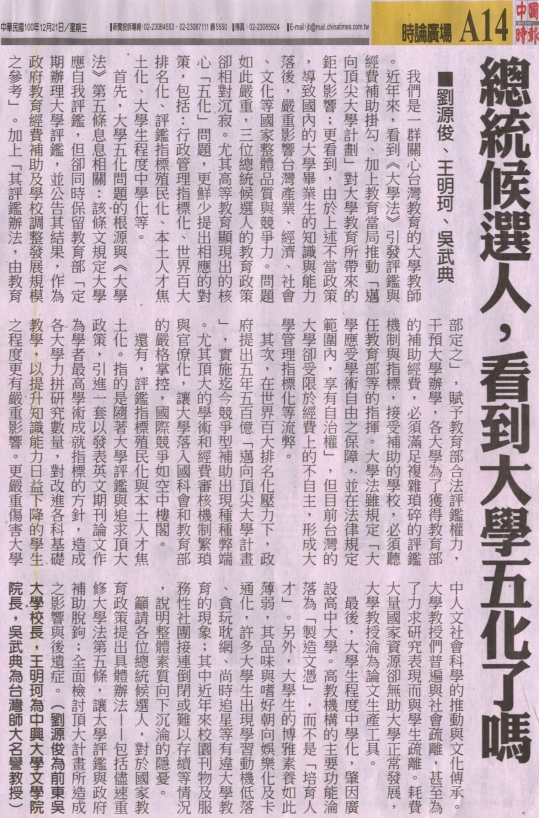 籲請各位總統候選人,對於國家教育政策提出具體辦法||包括儘速重修大學法第五條,讓大學評鑑與政府補助脫鉤;全面檢討頂大計畫所造成之影響與後遺症。(劉源俊為前東吳大學校長,王明珂為中興大學文學院院長,吳武典為台灣師大名譽教授)