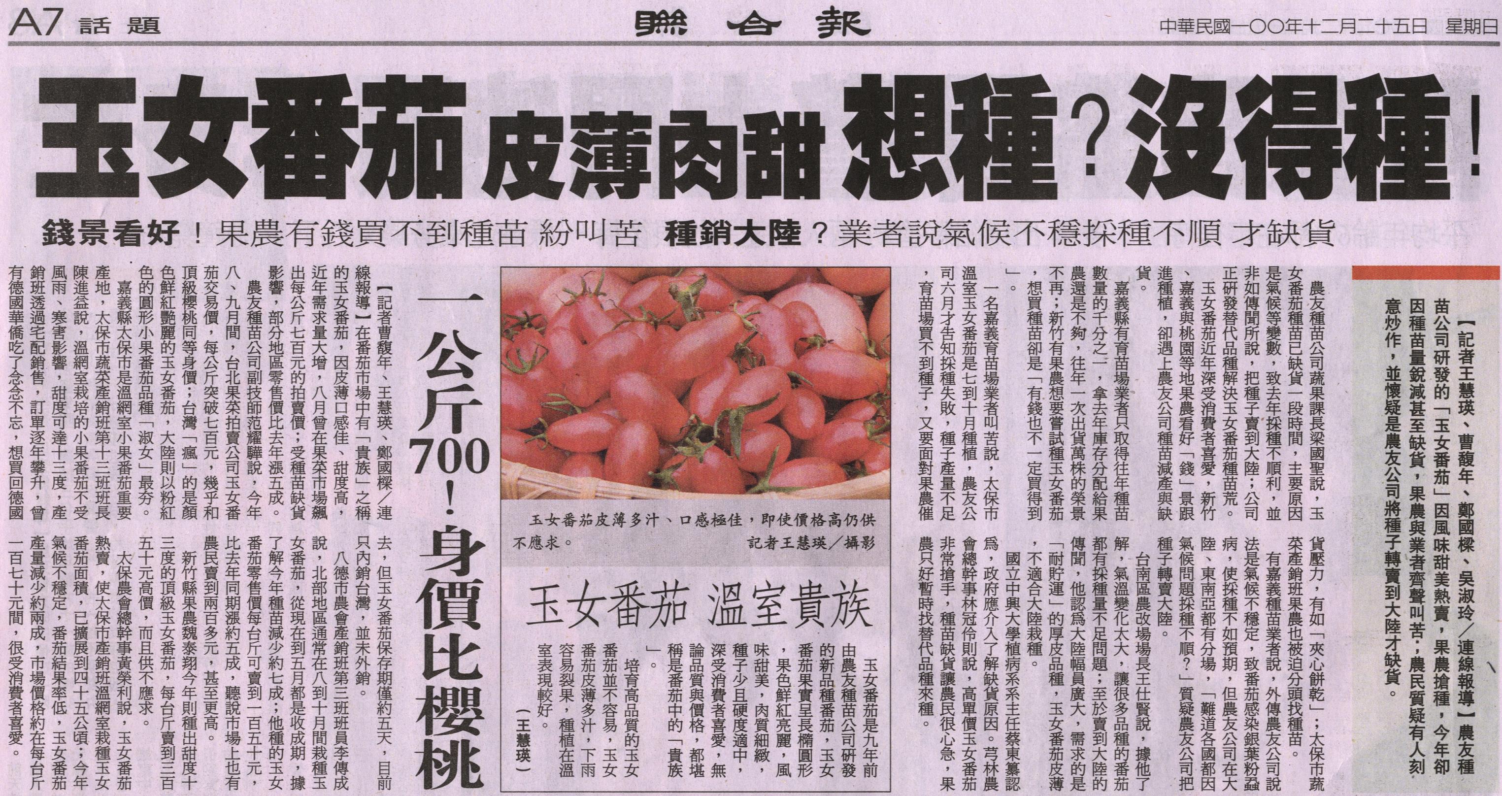 農友種苗公司研發的「玉女番茄」因風味甜美熱賣,果農搶種,今年卻因種苗量銳減甚至缺貨,果農與業者齊聲叫苦;農民質疑有人刻意炒作,並懷疑是農友公司將種子轉賣到大陸才缺貨。