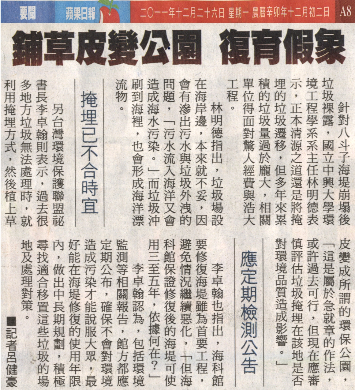 掩埋已不合時宜 另台灣環境保護聯盟祕書長李卓翰則表示,過去很多地方垃圾無法處理時,就利用掩埋方式,然後植上草皮變成所謂的環保公園,「這是屬於急就章的作法,或許過去可行,但現在應審慎評估垃圾掩埋在該地是否對環境品質造成影響。」