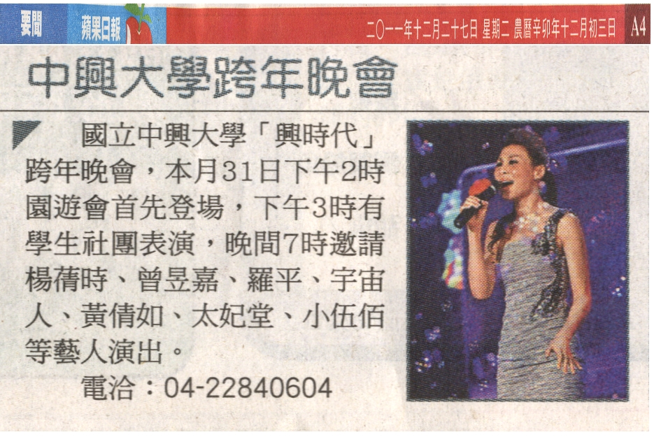 國立中興大學「興時代」跨年晚會,本月31日下午2時園遊會首先登場,下午3時有學生社團表演,晚間7時邀請楊蒨時、曾昱嘉、羅平、宇宙人、黃倩如、太妃堂、小伍佰等藝人演出。