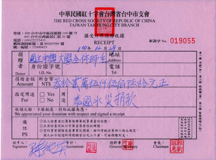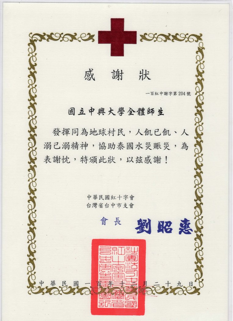 興大泰國學生社團及國際事務處已於12/29以國立中興大學全體師生名義捐款至中華民國紅十字會,詳如附件。