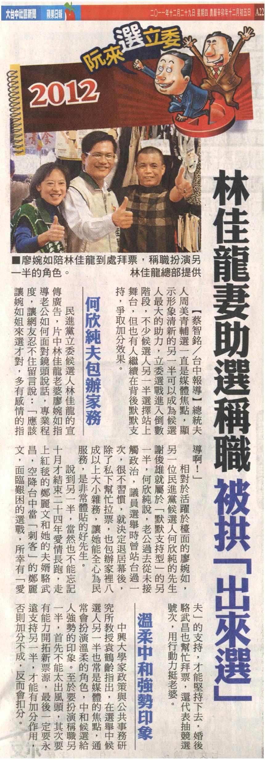 民進黨立委候選人林佳龍的宣傳廣告,片中林佳龍老婆廖婉如指導老公如何面對鏡頭說話,專業程度,讓網友忍不住留言說:「應該讓婉如姐來選才對,多有感情的指導啊!」
