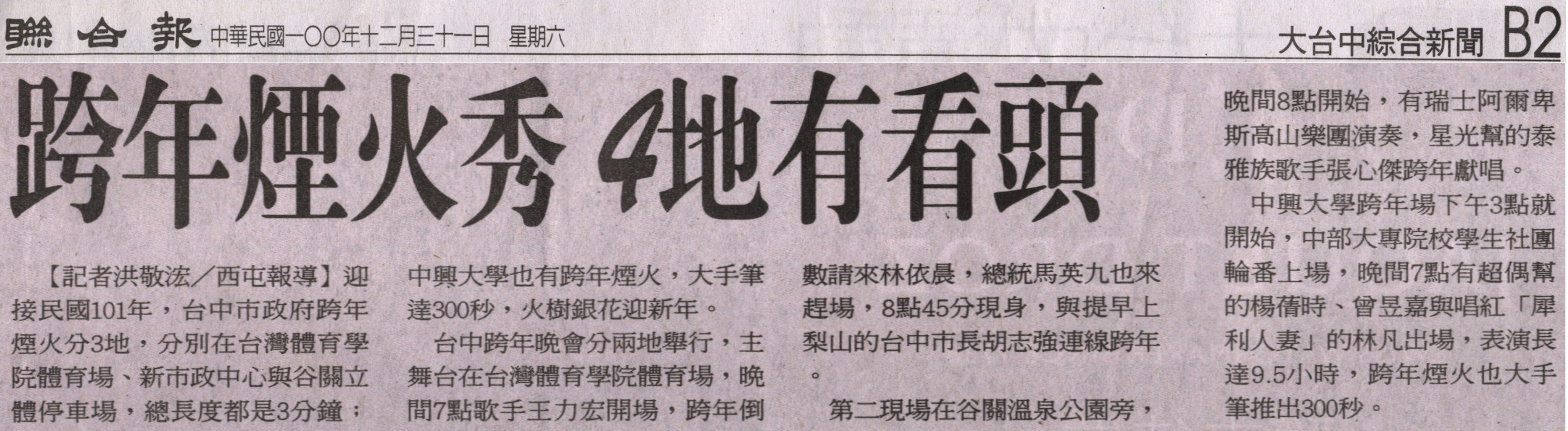 迎接民國101年,台中市政府跨年煙火分3地,分別在台灣體育學院體育場、新市政中心與谷關立體停車場,總長度都是3分鐘;中興大學也有跨年煙火,大手筆達300秒,火樹銀花迎新年。