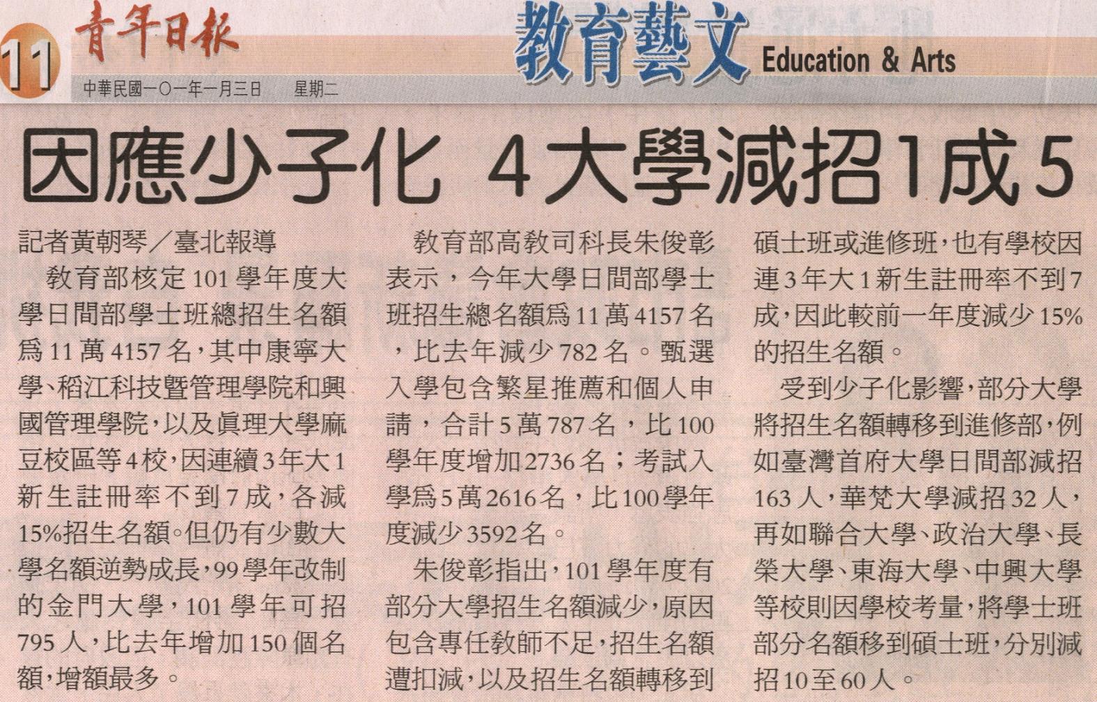 教育部核定101學年度大學日間部學士班總招生名額為11萬4157名,其中康寧大學、稻江科技暨管理學院和興國管理學院,以及真理大學麻豆校區等4校,因連續3年大1新生註冊率不到7成,各減15%招生名額。但仍有少數大學名額逆勢成長,99學年改制的金門大學,101學年可招795人,比去年增加150個名額,增額最多。教育部高教司科長朱俊彰表示,今年大學日間部學士班招生總名額為11萬4157名,比去年減少782名。甄選入學包含繁星推薦和個人申請,合計5萬787名,比100學年度增加2736名;考試入學為5萬2616名,比100學年度減少3592名。