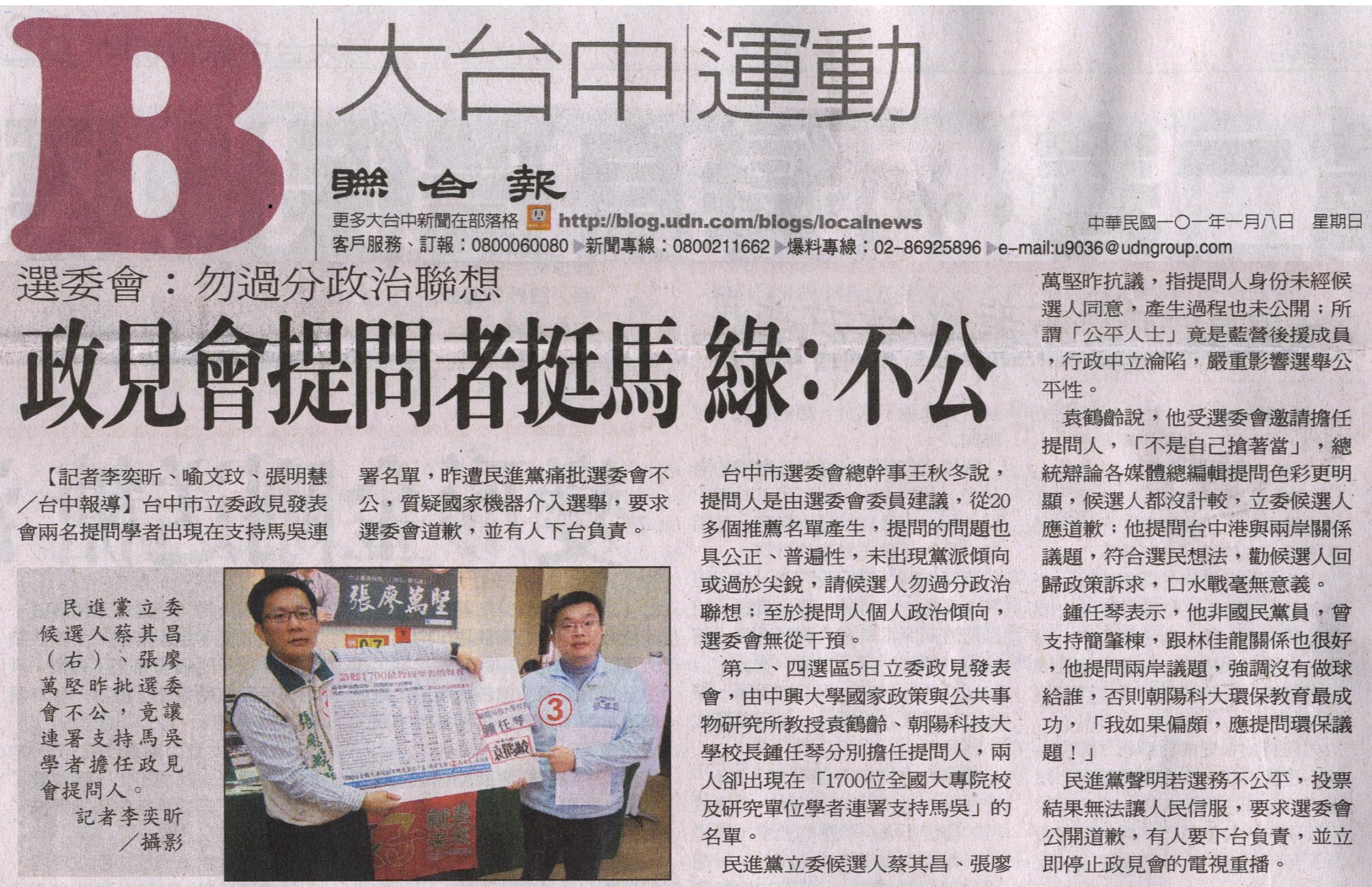 第一、四選區5日立委政見發表會,由中興大學國家政策與公共事物研究所教授袁鶴齡、朝陽科技大學校長鍾任琴分別擔任提問人,兩人卻出現在「1700位全國大專院校及研究單位學者連署支持馬吳」的名單。