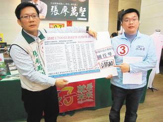 民進黨立委候選人蔡其昌(右)、張廖萬堅昨批選委會不公,竟讓連署支持馬吳學者擔任政見會提問人。 |