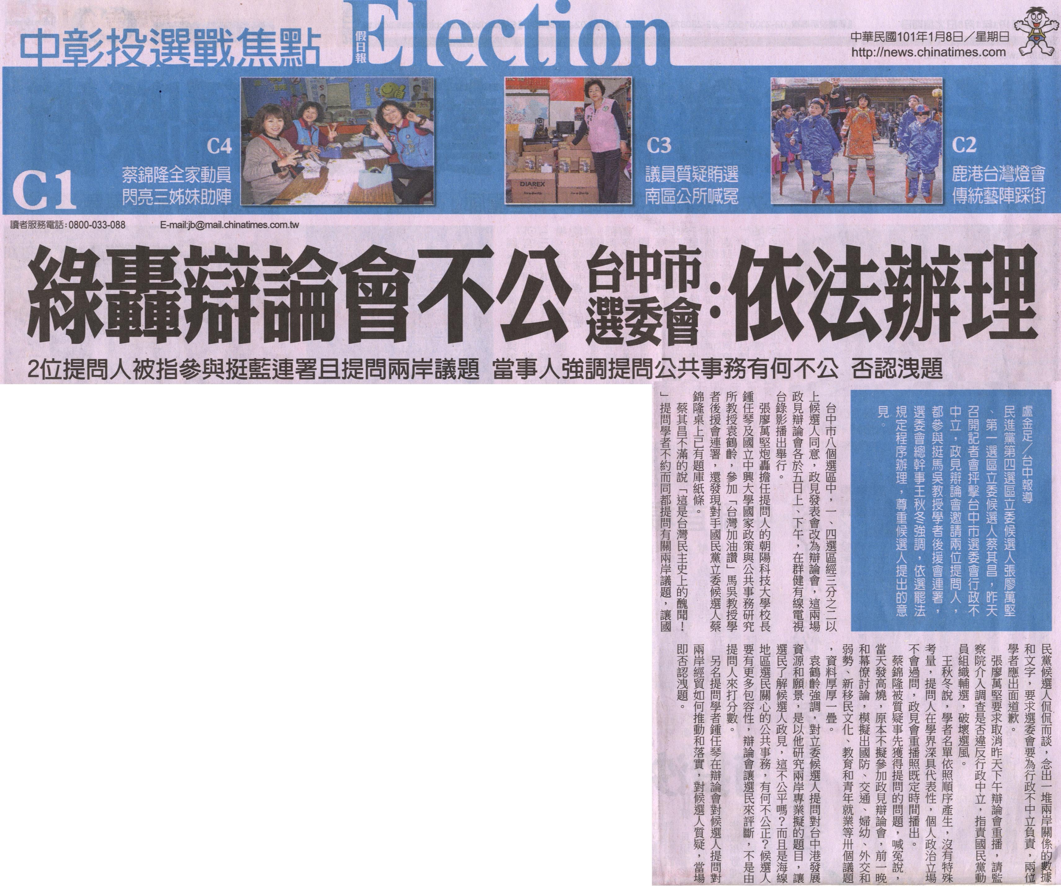 台中市八個選區中,一、四選區經三分之二以上候選人同意,政見發表會改為辯論會,這兩場政見辯論會各於五日上、下午,在群健有線電視台錄影播出舉行。