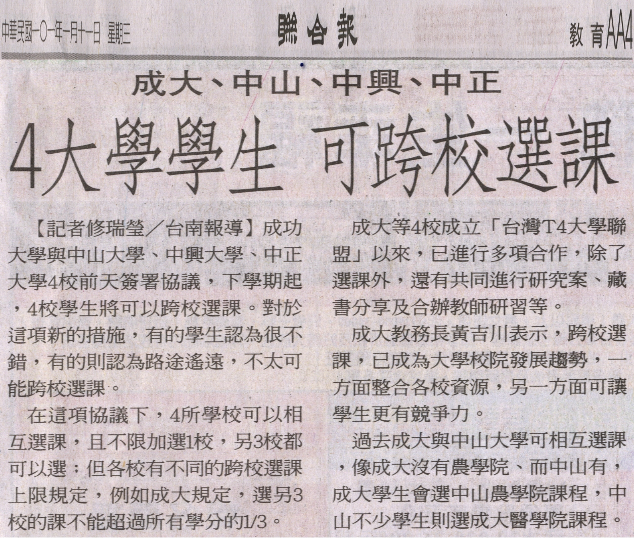 成大等4校成立「台灣T4大學聯盟」以來,已進行多項合作,除了選課外,還有共同進行研究案、藏書分享及合辦教師研習等。