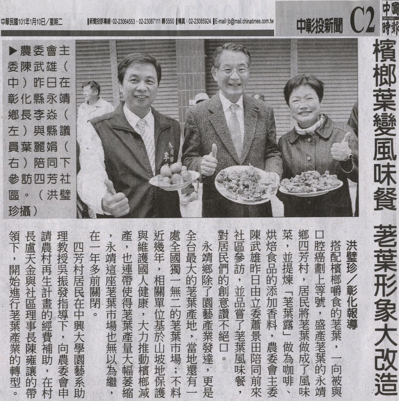 搭配檳榔嚼食的荖葉,一向被與口腔癌劃上等號,盛產荖葉的永靖鄉四芳村,居民將荖葉做成了風味菜,並提煉「荖葉露」做為咖啡、烘焙食品的添加香料,農委會主委陳武雄昨日由立委蕭景田陪同前來社區參訪,並品嘗了荖葉風味餐,對居民們的創意讚不絕口。