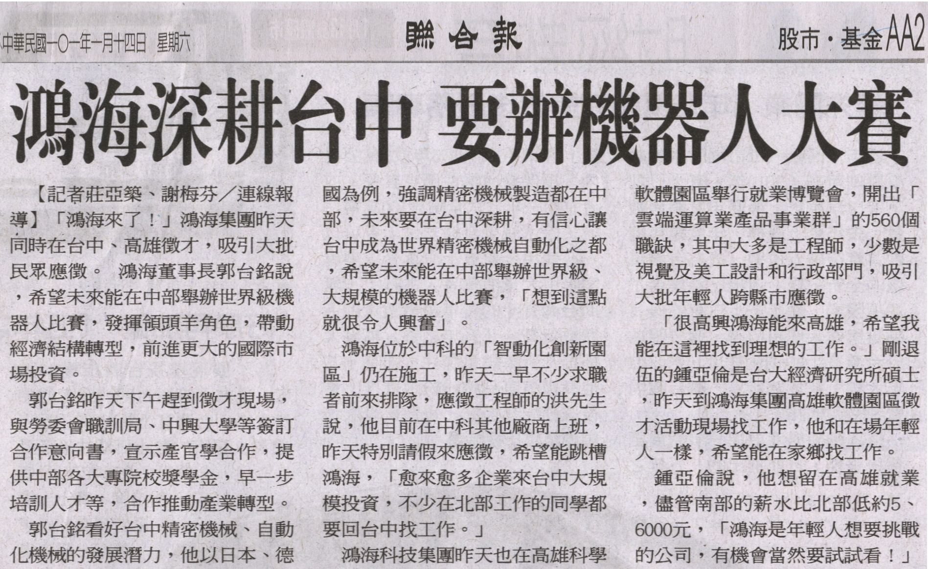 「鴻海來了!」鴻海集團昨天同時在台中、高雄徵才,吸引大批民眾應徵。 鴻海董事長郭台銘說,希望未來能在中部舉辦世界級機器人比賽,發揮領頭羊角色,帶動經濟結構轉型,前進更大的國際市場投資。