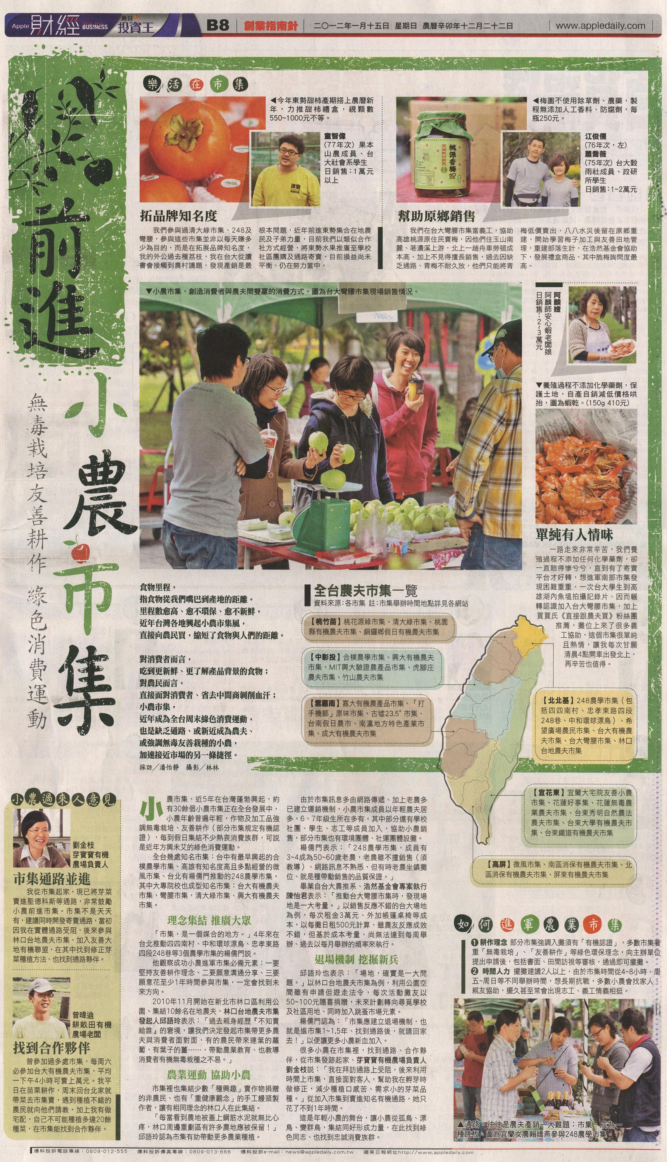 小農市集, 近年成為全台周末綠色消費運動, 也是缺乏通路、或新近成為農夫、 或強調無毒友善栽種的小農, 加速接近市場的另一條捷徑。