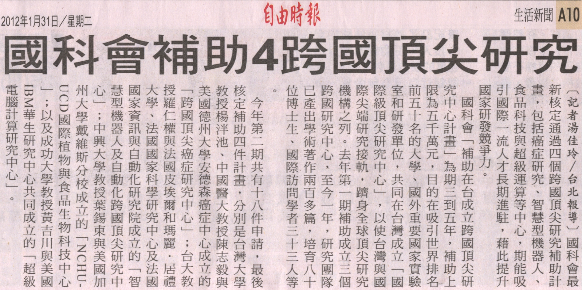 國科會「補助在台成立跨國頂尖研究中心計畫」為期三到五年,補助上限為五千萬元,目的在吸引世界排名前五十名的大學、國外重要國家實驗室和研發單位,共同在台灣成立「國際級頂尖研究中心」,以使台灣與國際尖端研究接軌,躋身全球頂尖研究機構之列。去年第一期補助成立三個跨國研究中心,至今一年,研究團隊已產出學術著作兩百多篇,培育八十位博士生、國際訪問學者三十三人等。