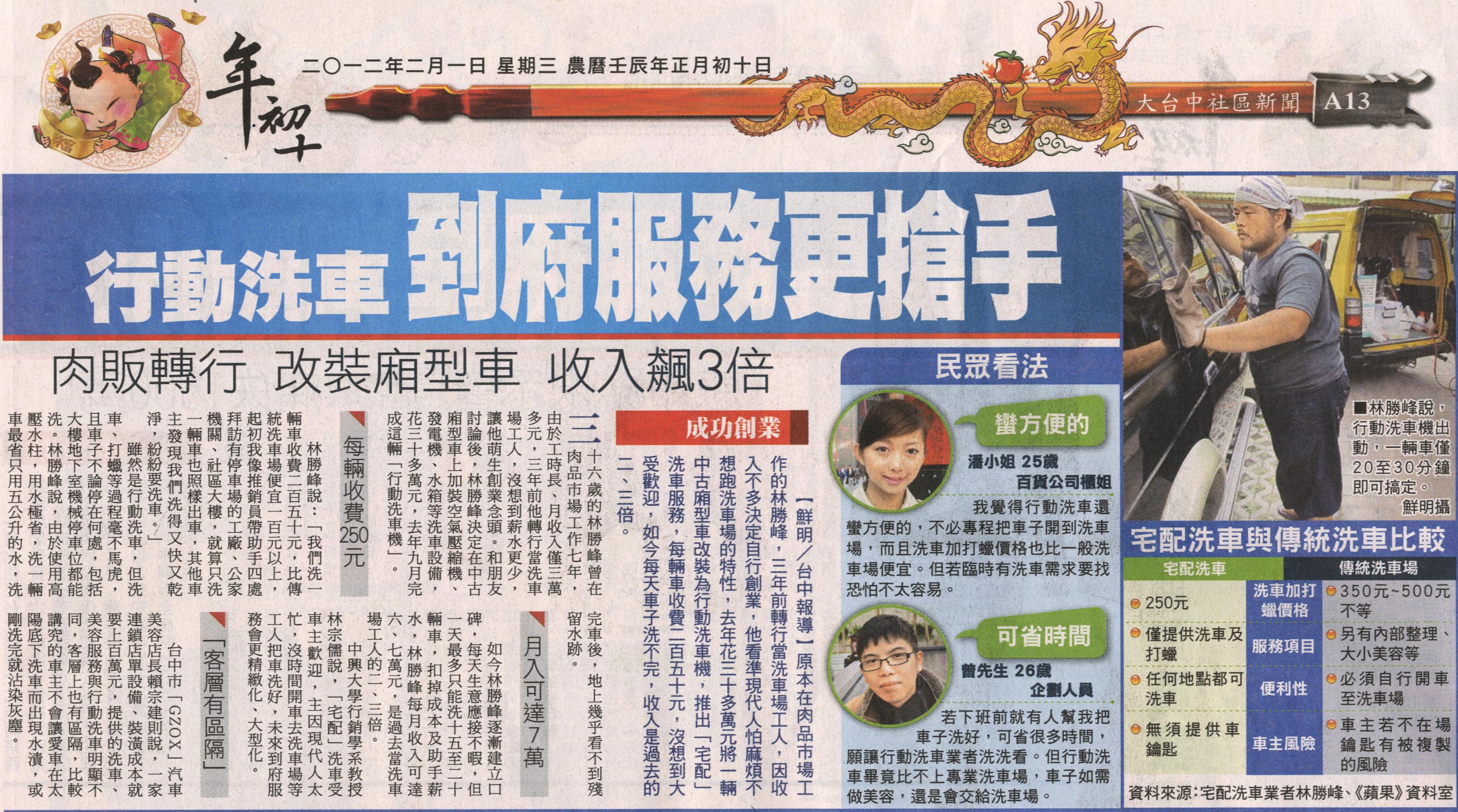 原本在肉品市場工作的林勝峰,三年前轉行當洗車場工人,因收入不多決定自行創業,他看準現代人怕麻煩不想跑洗車場的特性,去年花三十多萬元將一輛中古廂型車改裝為行動洗車機,推出「宅配」洗車服務,每輛車收費二百五十元,沒想到大受歡迎,如今每天車子洗不完,收入是過去的二、三倍。