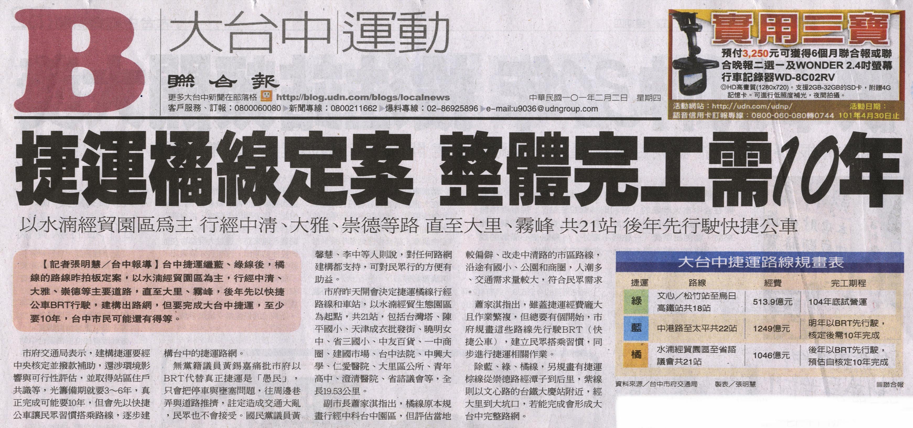 台中捷運繼藍、綠線後,橘線的路線昨拍板定案,以水湳經貿園區為主,行經中清、大雅、崇德等主要道路,直至大里、霧峰,後年先以快捷公車BRT行駛,建構出路網,但要完成大台中捷運,至少要10年,台中市民可能還有得等。