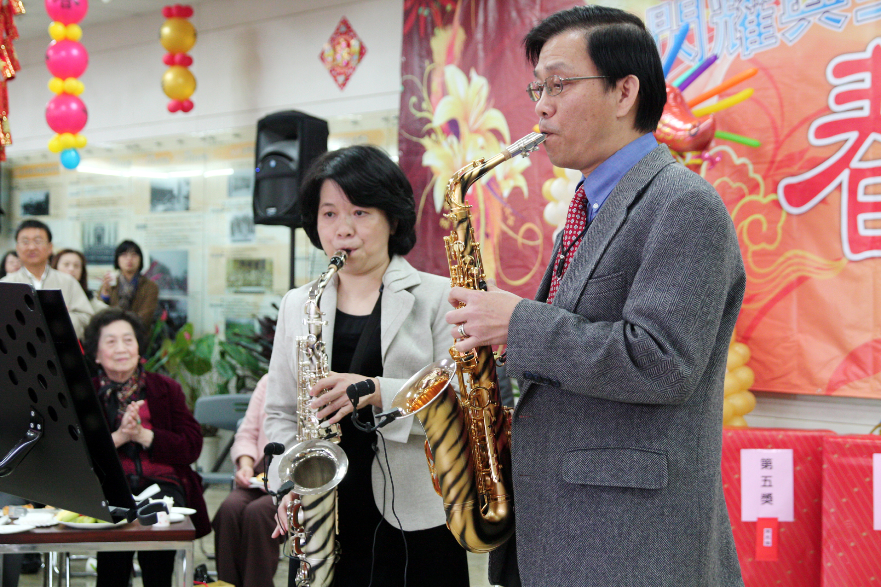 摸彩中間穿插5段餘興節目,包含樂器演奏、歌唱與拳舞表演全由校內師生擔綱表演,展現師生多才多藝的一面。食生系方繼教授與應經系鄭蕙燕教授夫婦表演薩克斯風,帶來<月亮代表我的心>與<快樂的出帆>兩首曲目,眾人陶醉共鳴。實驗林管處李明益秘書演唱起台語歌曲,中氣十足,帶動現場氣氛。諮商中心老師與志工的陶笛演奏與口琴社的表演,樂聲悅耳動人。最後的壓軸為太極拳社帶來太極拳表演。
