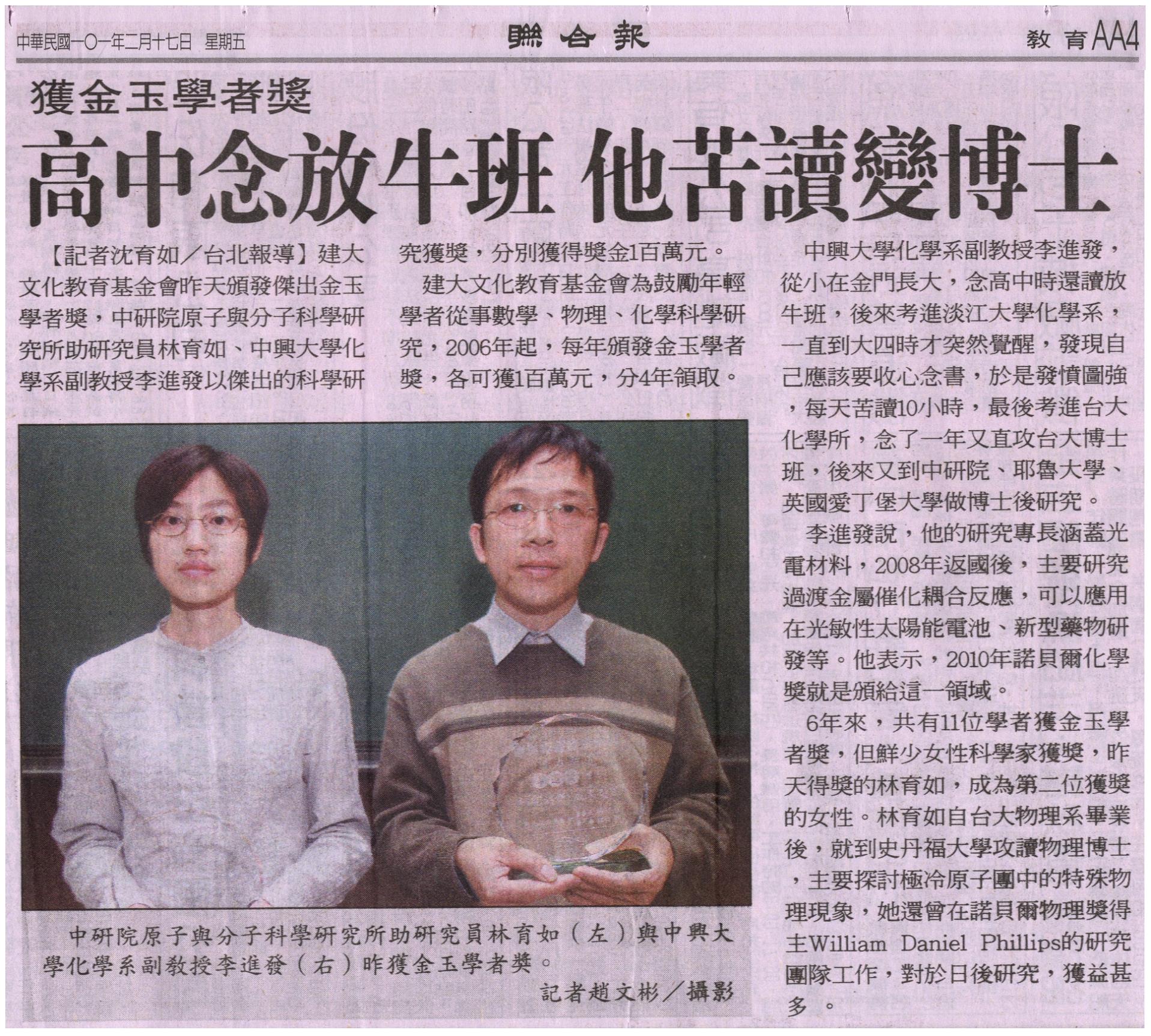 建大文化教育基金會昨天頒發傑出金玉學者獎,中研院原子與分子科學研究所助研究員林育如、中興大學化學系副教授李進發以傑出的科學研究獲獎,分別獲得獎金1百萬元。