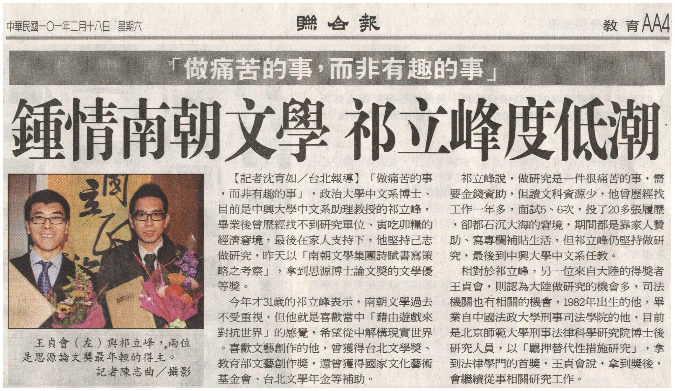 「做痛苦的事,而非有趣的事」,政治大學中文系博士、目前是中興大學中文系助理教授的祁立峰,畢業後曾歷經找不到研究單位、寅吃卯糧的經濟窘境,最後在家人支持下,他堅持己志做研究,昨天以「南朝文學集團詩賦書寫策略之考察」,拿到思源博士論文獎的文學優等獎。