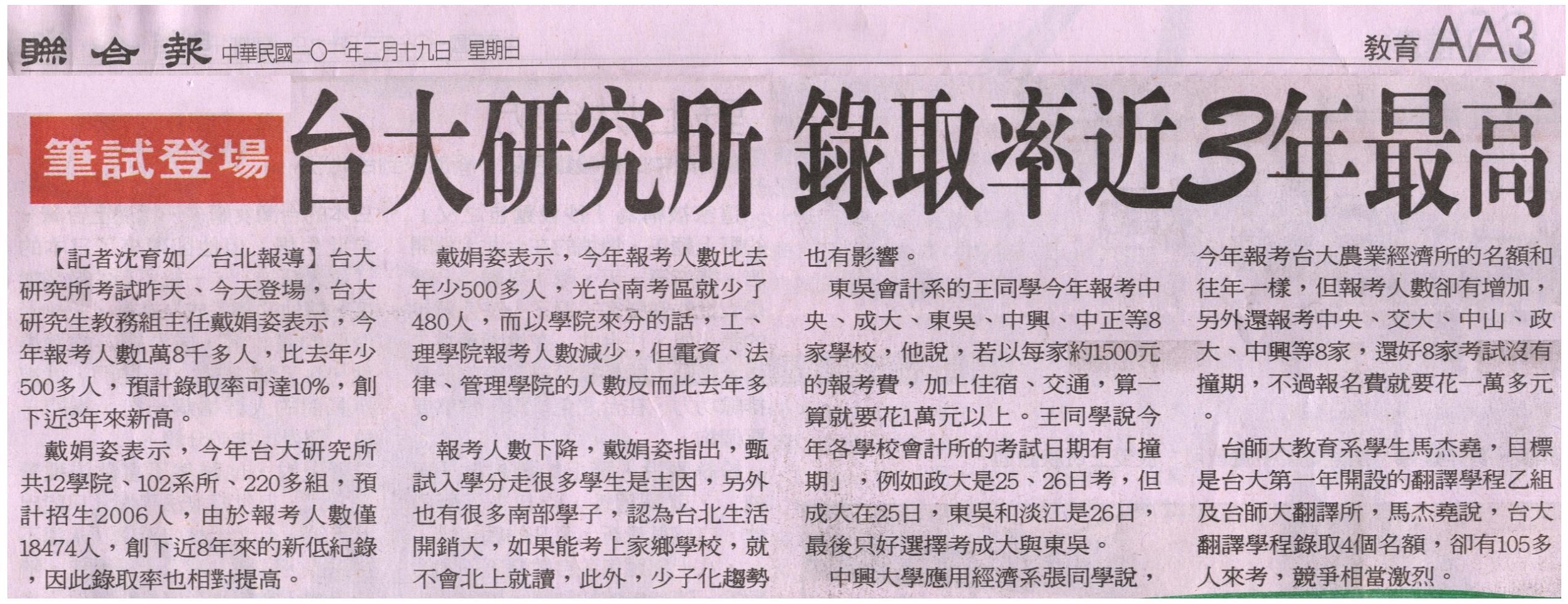 台師大教育系學生馬杰堯,目標是台大第一年開設的翻譯學程乙組及台師大翻譯所,馬杰堯說,台大翻譯學程錄取4個名額,卻有105多人來考,競爭相當激烈。