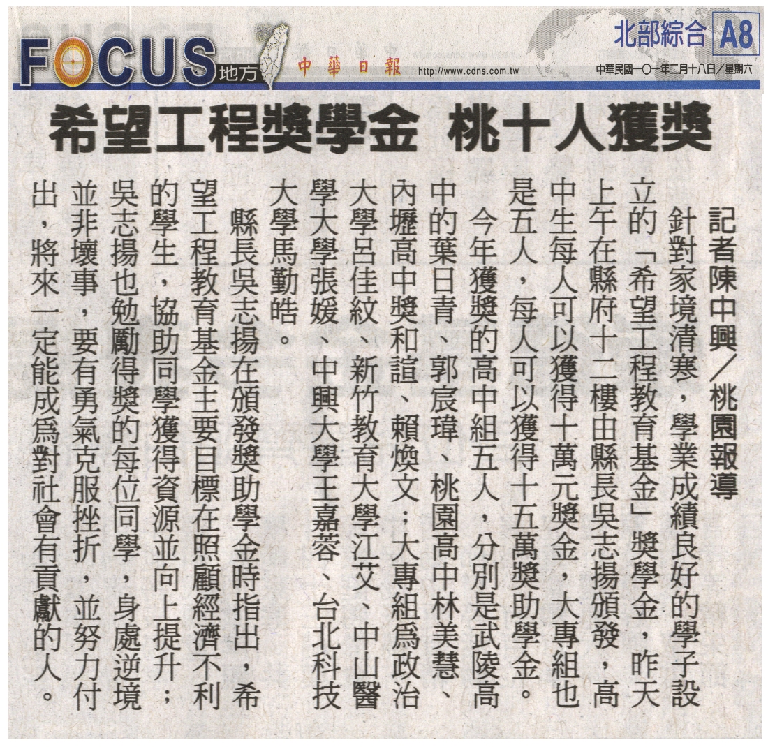 針對家境清寒,學業成績良好的學子設立的「希望工程教育基金」獎學金,昨天上午在縣府十二樓由縣長吳志揚頒發,高中生每人可以獲得十萬元獎金,大專組也是五人,每人可以獲得十五萬獎助學金。
