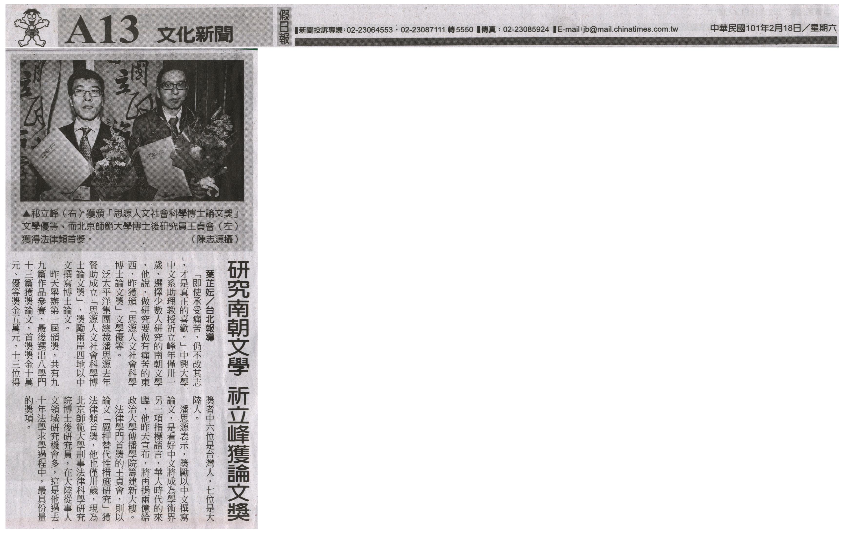 法律學門首獎的王貞會,則以論文「羈押替代性措施研究」獲法律類首獎,他也僅卅歲,現為北京師範大學刑事法律科學研究院博士後研究員,在大陸從事人文領域研究機會多,這是他過去十年法學求學過程中,最具份量的獎項。