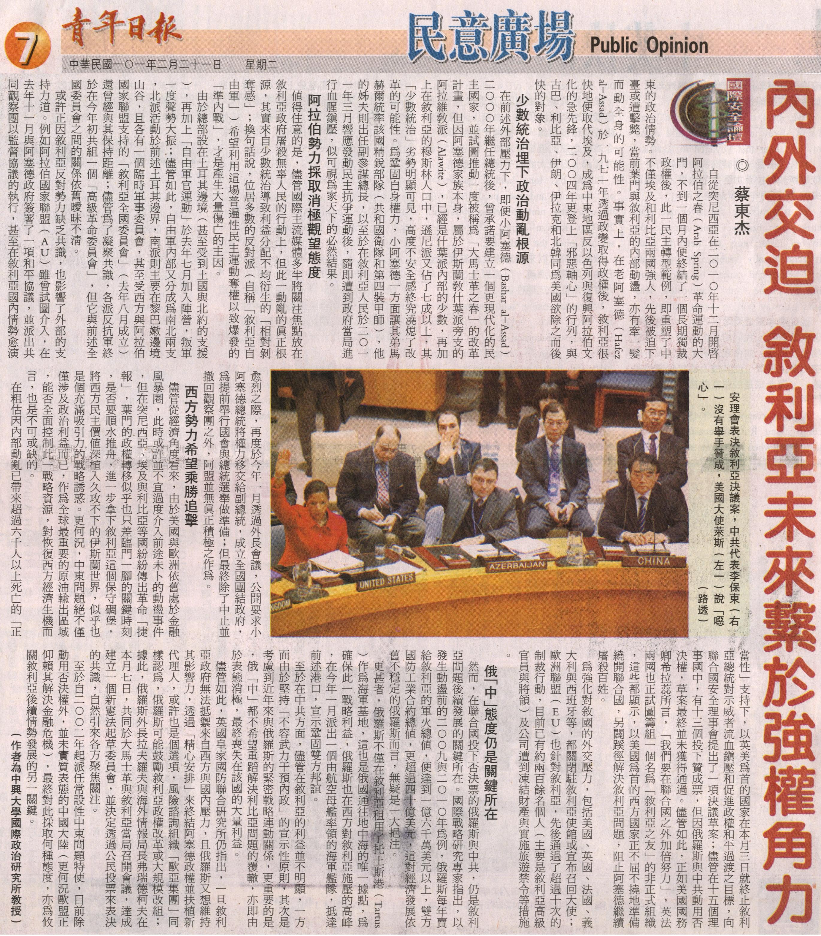 至於自二○○二年起派任常設性中東問題特使,目前除動用否決權外,並未實質表態的中國大陸(更何況歐盟正仰賴其解決金融危機),最終對此採取何種態度,亦為攸關敘利亞後續情勢發展的另一關鍵。