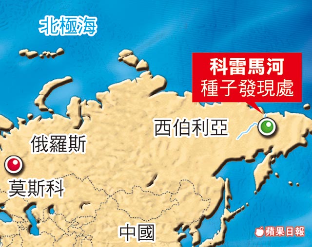 發現3萬年種子位置圖 俄羅斯學者在永凍層的松鼠巢穴中,挖出逾3萬年前的種子,栽種使其開花結果。