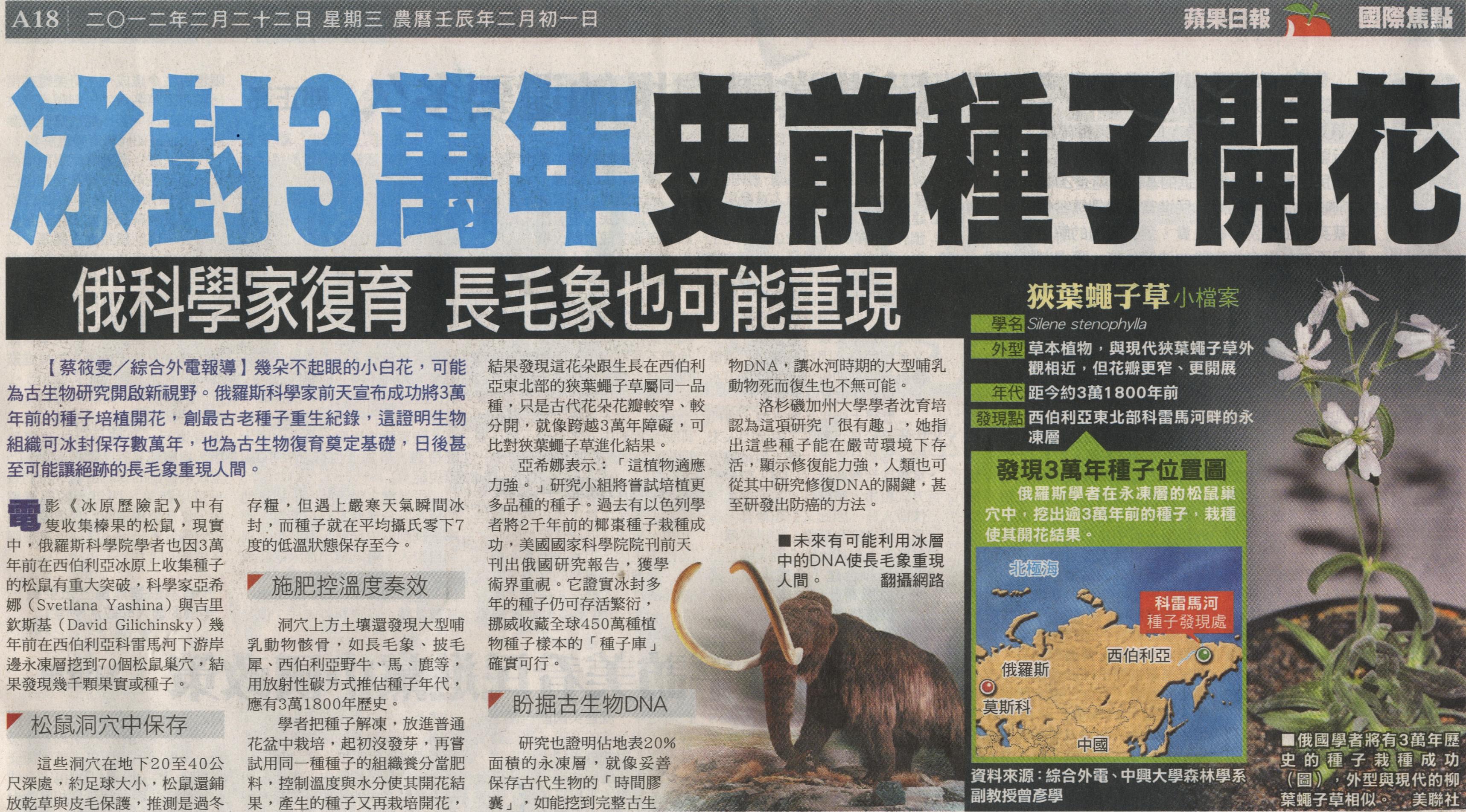 .發現點:西伯利亞東北部科雷馬河畔的永凍層 資料來源:綜合外電、中興大學森林學系副教授曾彥學