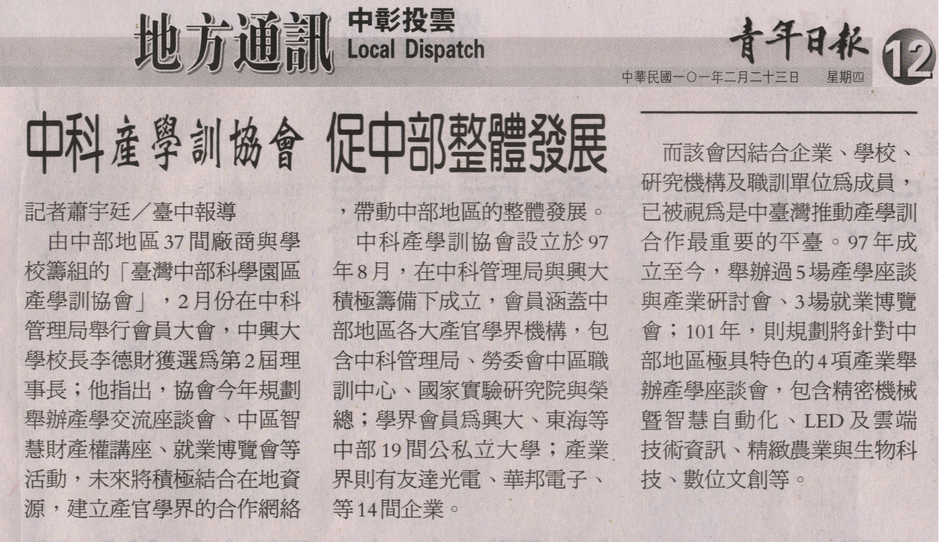 由中部地區37間廠商與學校籌組的「臺灣中部科學園區產學訓協會」,2月份在中科管理局舉行會員大會,中興大學校長李德財獲選為第2屆理事長;他指出,協會今年規劃舉辦產學交流座談會、中區智慧財產權講座、就業博覽會等活動,未來將積極結合在地資源,建立產官學界的合作網絡,帶動中部地區的整體發展。