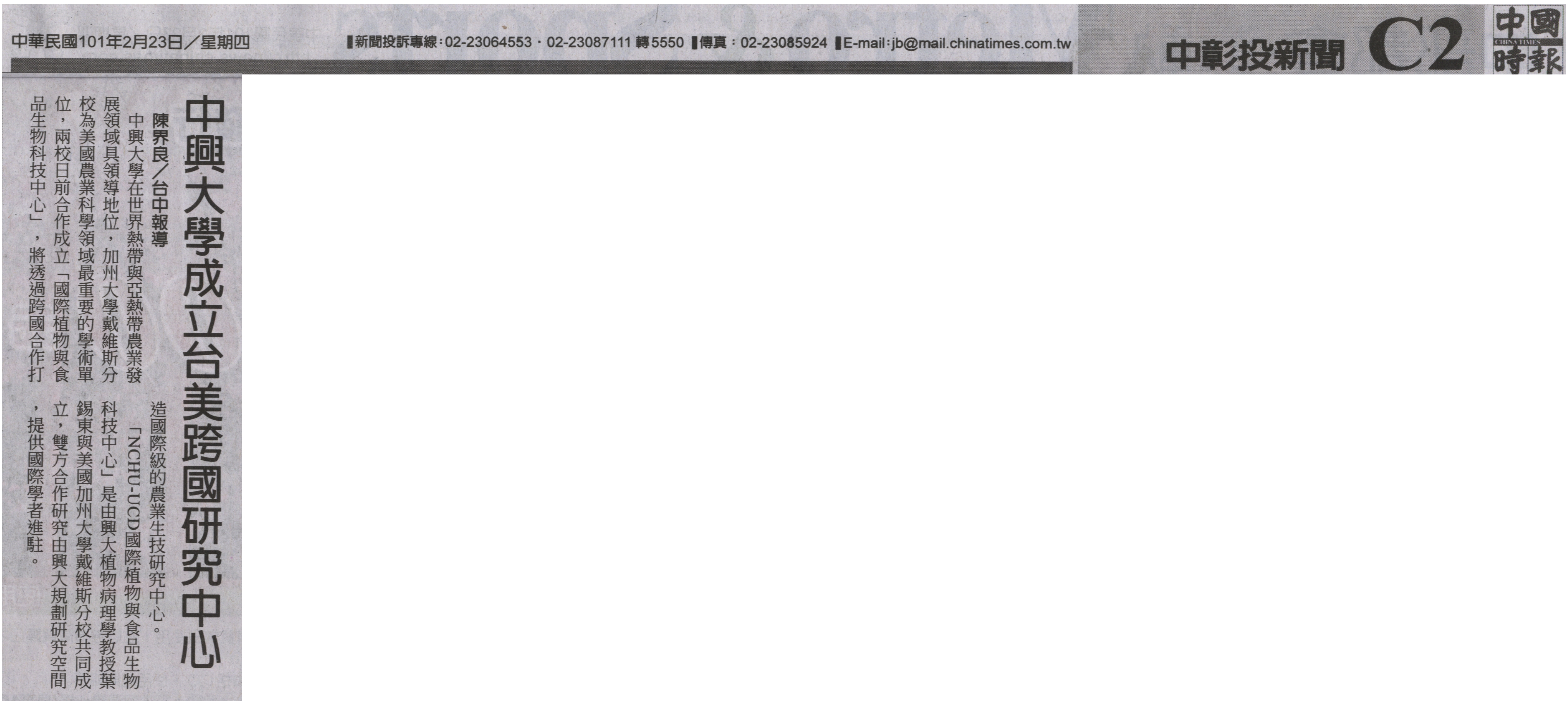 中興大學在世界熱帶與亞熱帶農業發展領域具領導地位,加州大學戴維斯分校為美國農業科學領域最重要的學術單位,兩校日前合作成立「國際植物與食品生物科技中心」,將透過跨國合作打造國際級的農業生技研究中心。