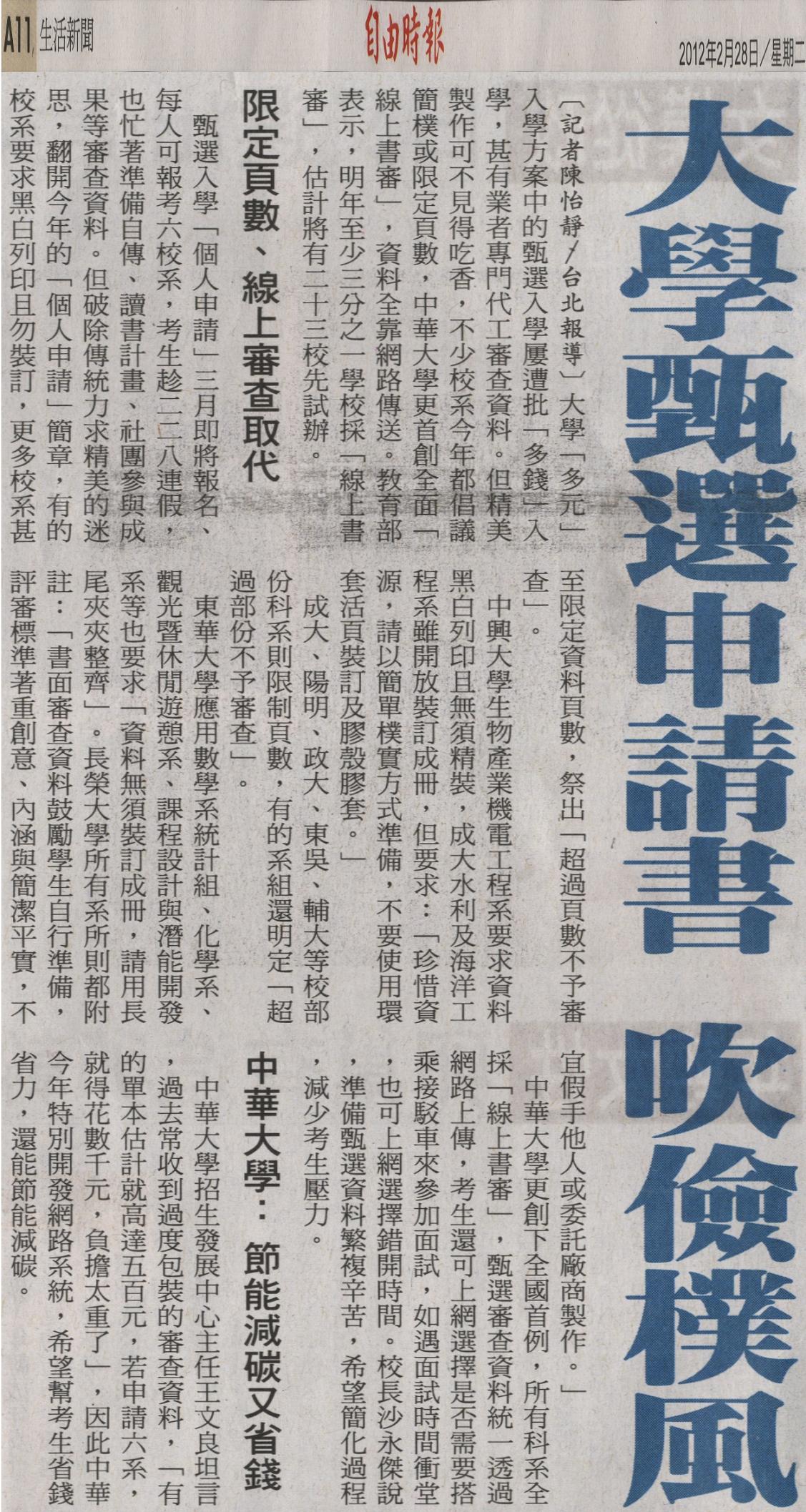 中華大學招生發展中心主任王文良坦言,過去常收到過度包裝的審查資料,「有的單本估計就高達五百元,若申請六系,就得花數千元,負擔太重了」,因此中華今年特別開發網路系統,希望幫考生省錢省力,還能節能減碳。