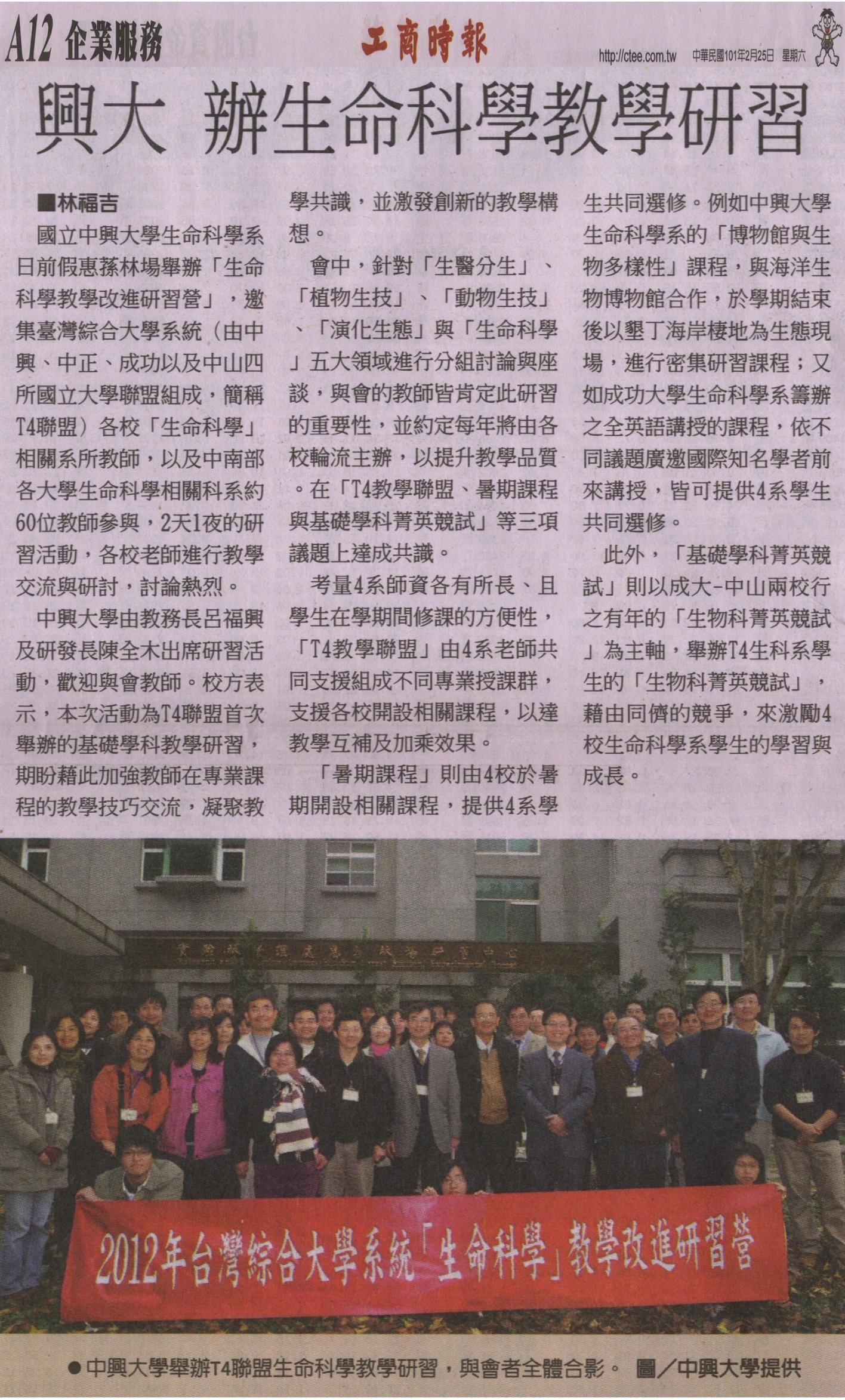 國立中興大學生命科學系日前假惠蓀林場舉辦「生命科學教學改進研習營」,邀集臺灣綜合大學系統(由中興、中正、成功以及中山四所國立大學聯盟組成,簡稱T4聯盟)各校「生命科學」相關系所教師,以及中南部各大學生命科學相關科系約60位教師參與,2天1夜的研習活動,各校老師進行教學交流與研討,討論熱烈。