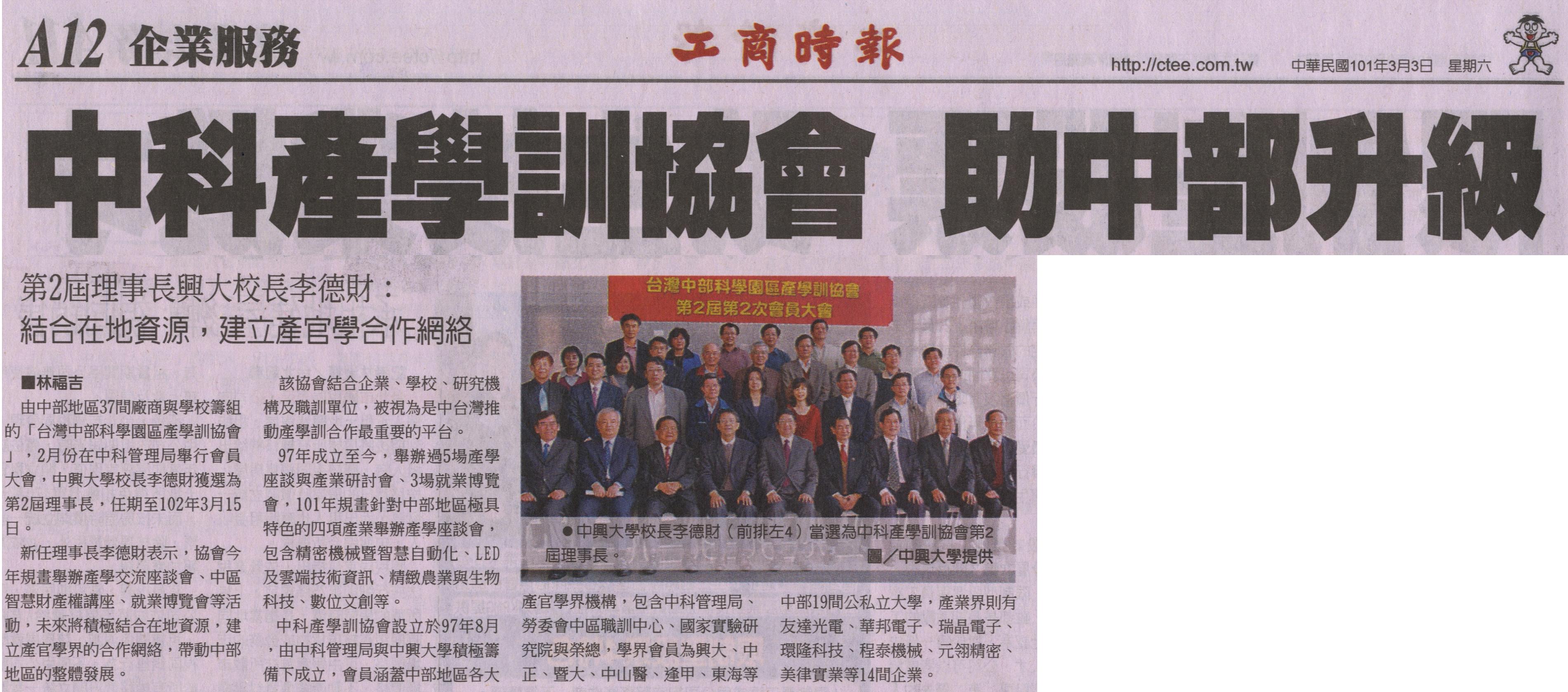 由中部地區37間廠商與學校籌組的「台灣中部科學園區產學訓協會」,2月份在中科管理局舉行會員大會,中興大學校長李德財獲選為第2屆理事長,任期至102年3月15日。