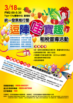 為了有效推廣統一發票及相關租稅法令宣導,財政部臺灣省中區國稅局臺中分局在3月18日(星期日)下午兩點假臺中Tiger City老虎城購物中心廣場前舉辦統一發票推行暨「逗陣哇寶趣」租稅宣導活動,除了邀請多攤手作藝術的「創意市集」和中部優質的「有機農夫市集」攤位外,現場只要捐贈101年1-2月或3-4月發票乙張即可兌換宣導品乙份及摸彩答題券乙張,數量有限,兌完為止。另外還有精采的街舞表演、綠色愛樂秀、發票競標享好禮以及好康的摸彩活動,中區國稅局臺中分局邀請大朋友、小朋友共同攜手蒞臨,一起參與這場充滿驚喜又趣味橫生的挖寶活動。