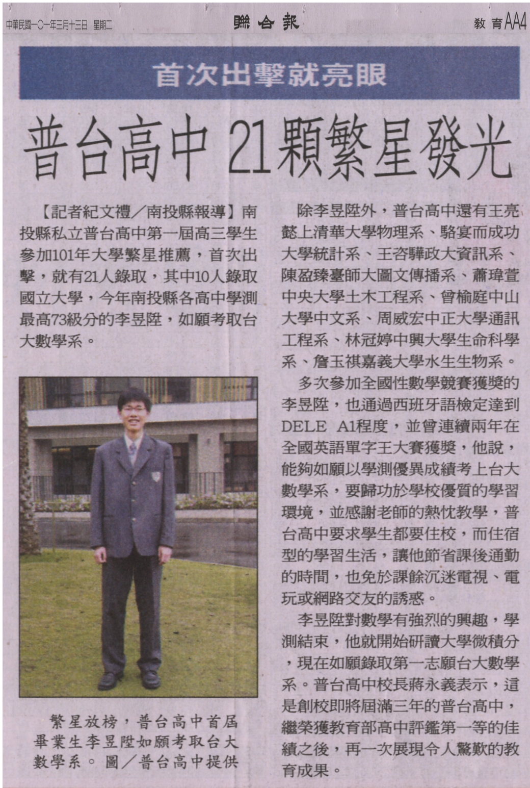 南投縣私立普台高中第一屆高三學生參加101年大學繁星推薦,首次出擊,就有21人錄取,其中10人錄取國立大學,今年南投縣各高中學測最高73級分的李昱陞,如願考取台大數學系。