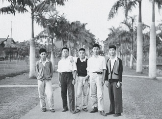 1957年秋天高希均(左二,時為大三學生)與同學合影於台中農學院椰林大道上。 |