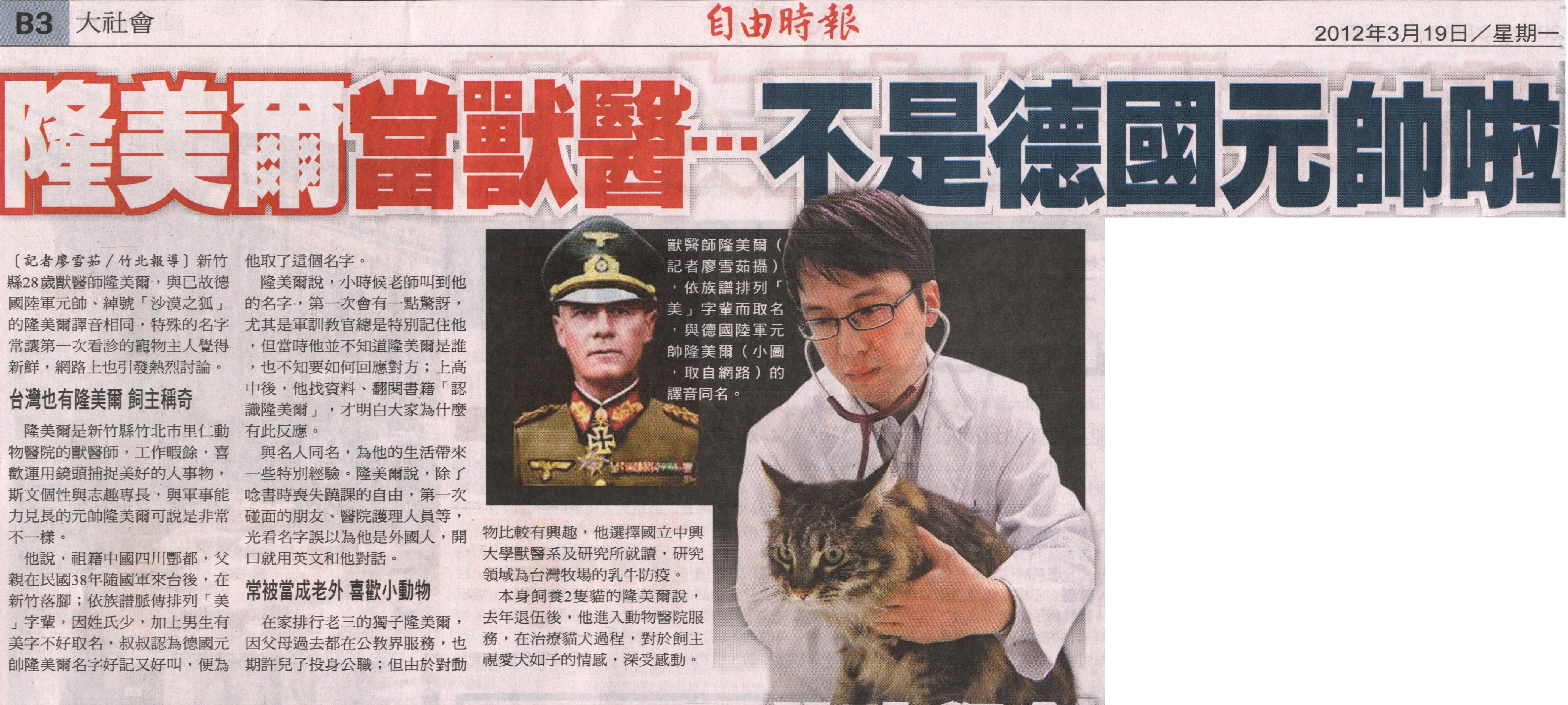 新竹縣28歲獸醫師隆美爾,與已故德國陸軍元帥、綽號「沙漠之狐」的隆美爾譯音相同,特殊的名字常讓第一次看診的寵物主人覺得新鮮,網路上也引發熱烈討論。