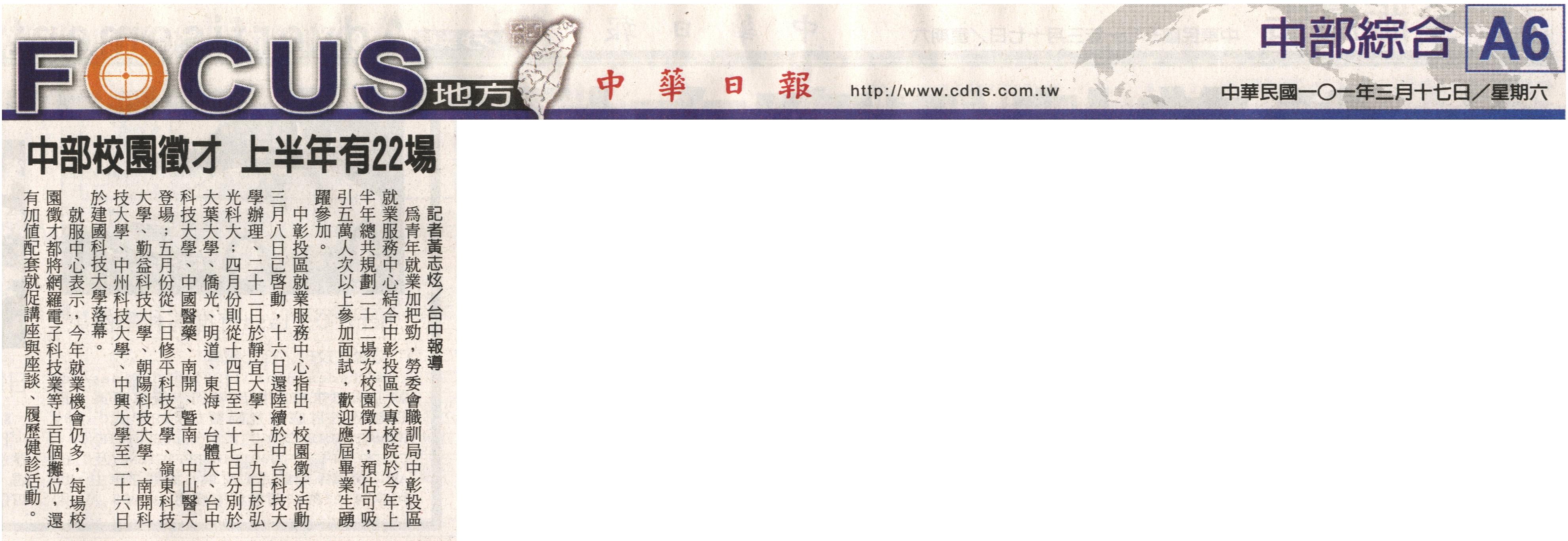 為青年就業加把勁,勞委會職訓局中彰投區就業服務中心結合中彰投區大專校院於今年上半年總共規劃二十二場次校園徵才,預估可吸引五萬人次以上參加面試,歡迎應屆畢業生踴躍參加。