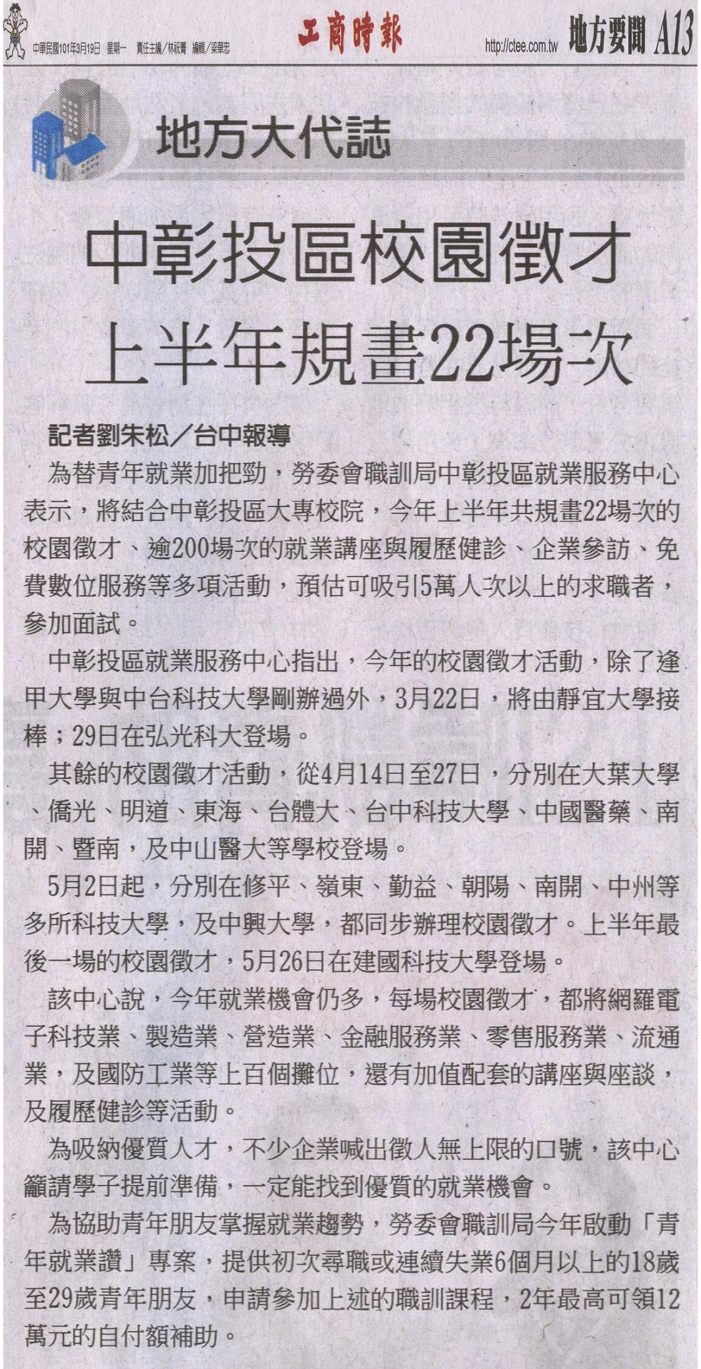 為替青年就業加把勁,勞委會職訓局中彰投區就業服務中心表示,將結合中彰投區大專校院,今年上半年共規畫22場次的校園徵才、逾 200場次的就業講座與履歷健診、企業參訪、免費數位服務等多項活動,預估可吸引5萬人次以上的求職者,參加面試。