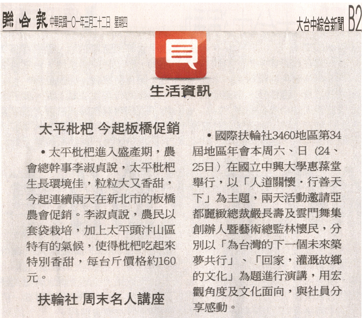 太平枇杷進入盛產期,農會總幹事李淑貞說,太平枇杷生長環境佳,粒粒大又香甜,今起連續兩天在新北市的板橋農會促銷。李淑貞說,農民以套袋栽培,加上太平頭汴山區特有的氣候,使得枇杷吃起來特別香甜,每台斤價格約160元。