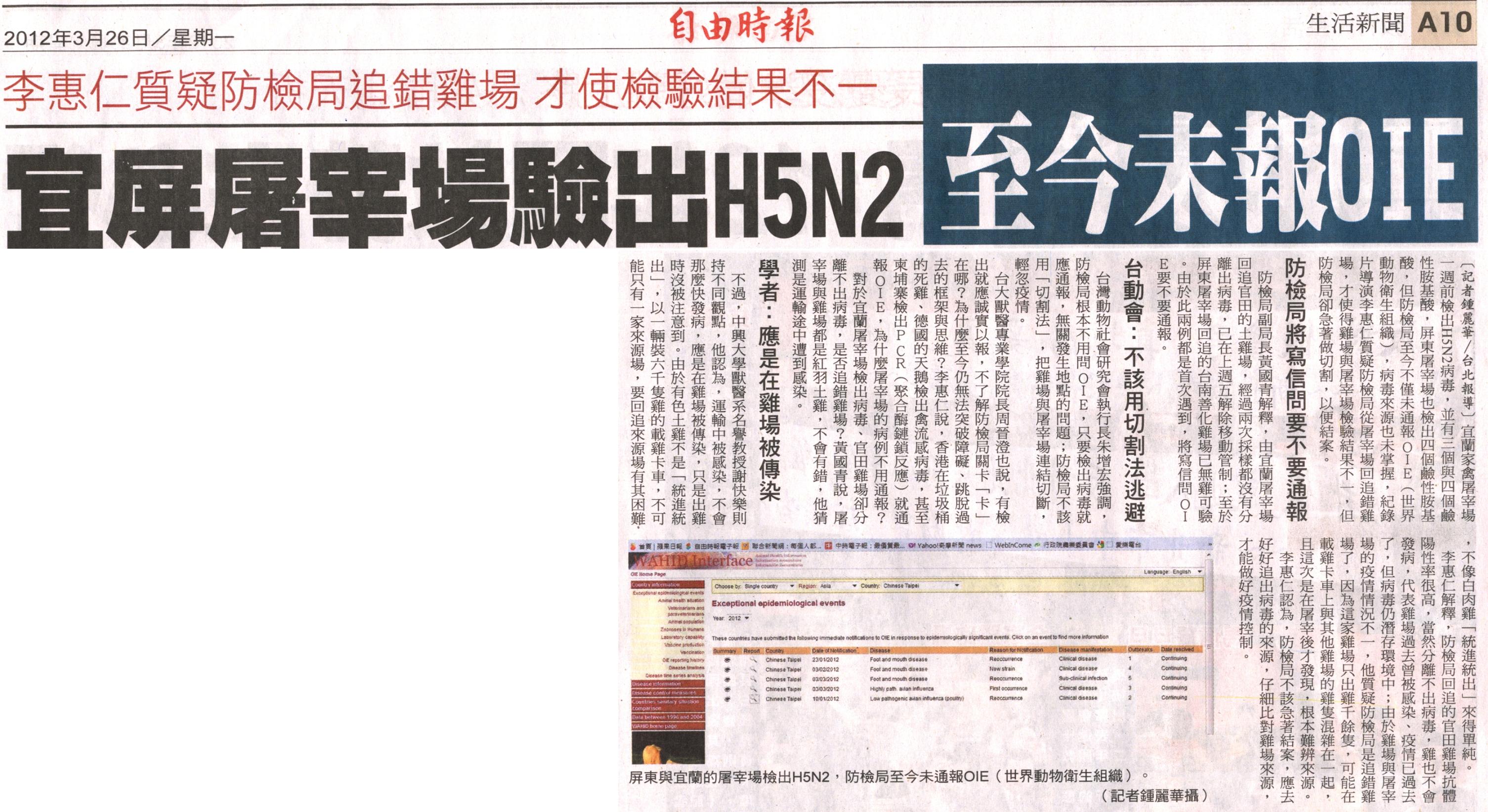 屏東與宜蘭的屠宰場檢出H5N2,防檢局至今未通報OIE(世界動物衛生組織) |
