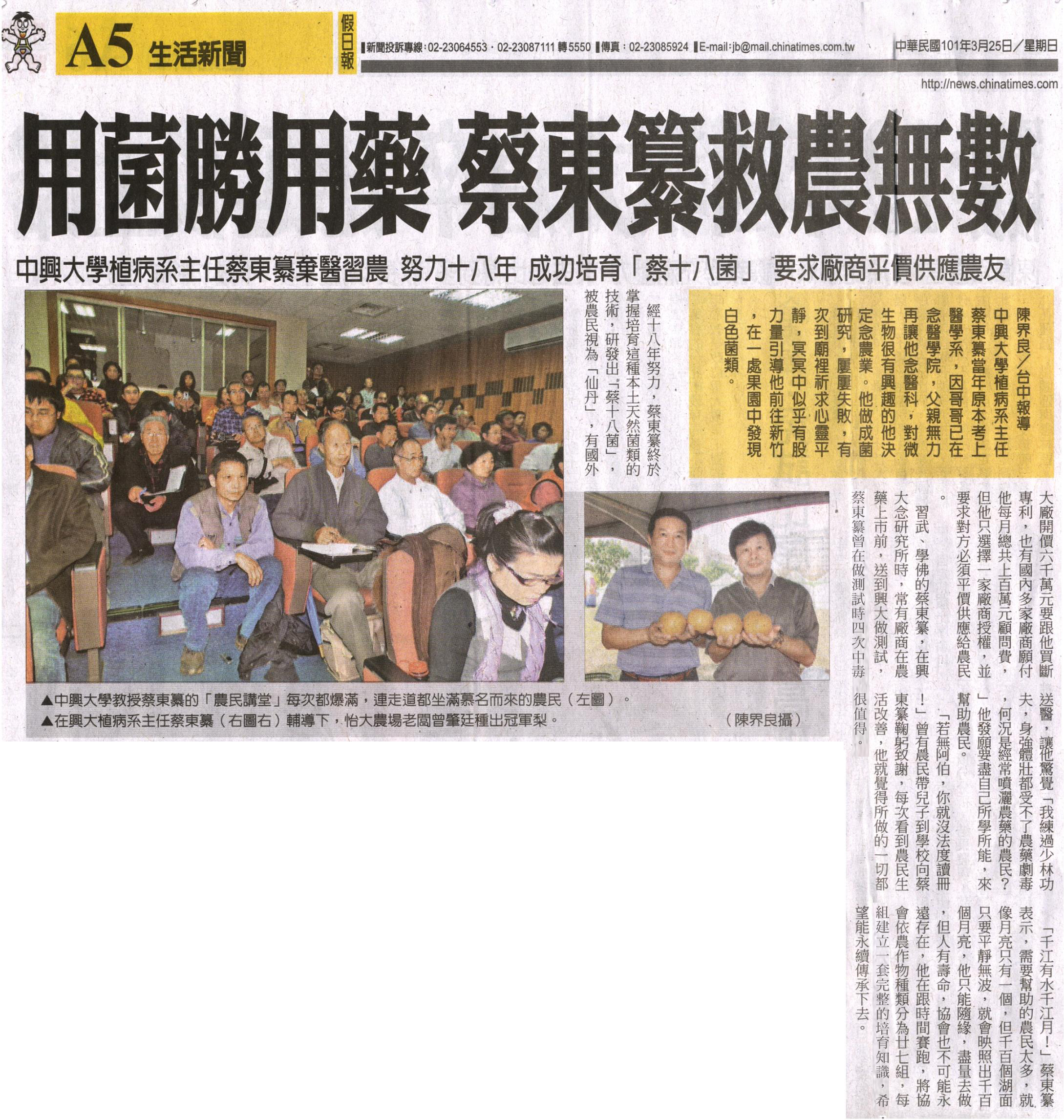 中興大學植病系主任蔡東纂棄醫習農,努力十八年,成功培育「蔡十八菌」,要求廠商平價供應農友。
