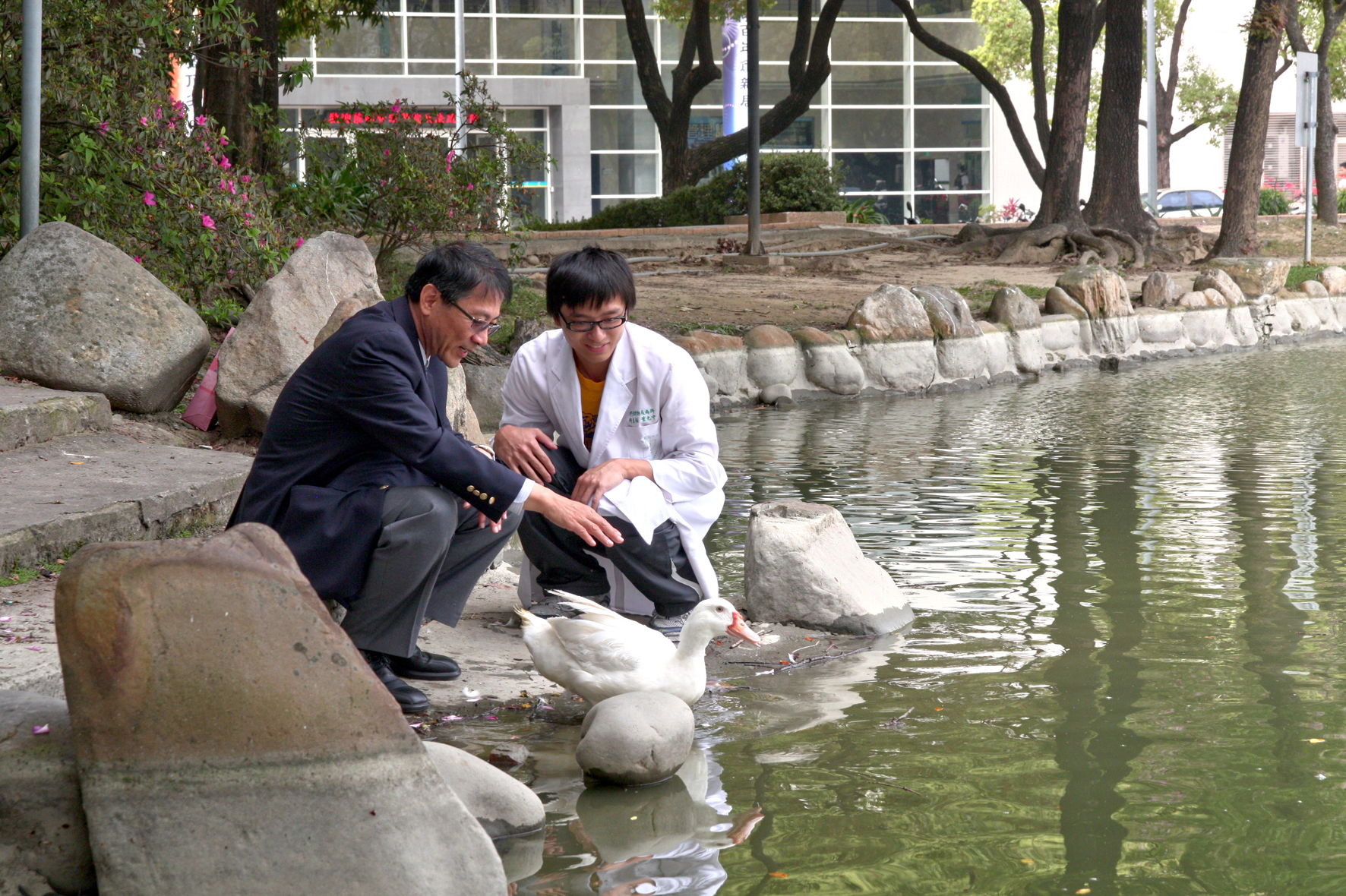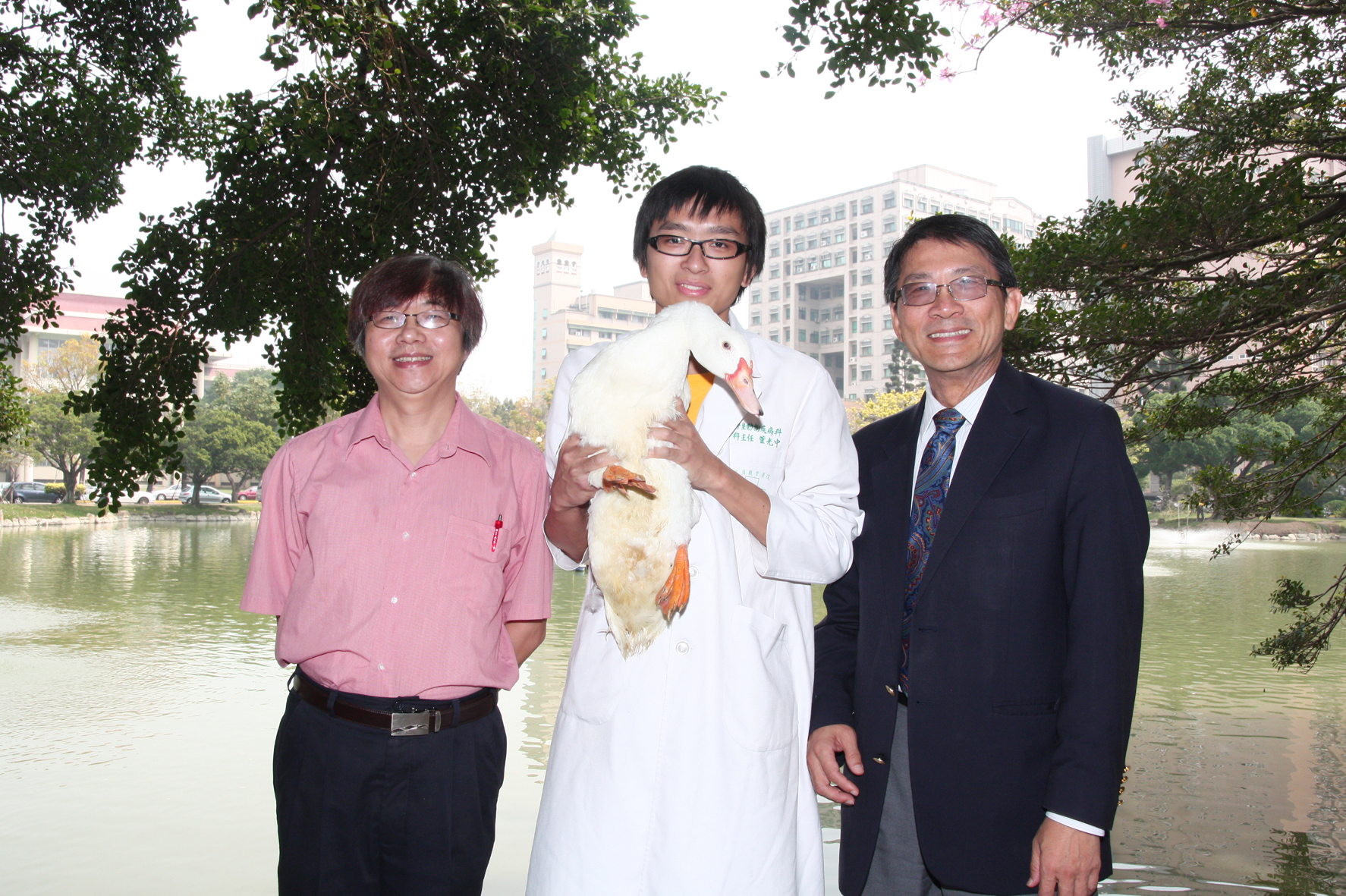 國立中興大學以有機生態校園著稱,中興湖更是師生及社區居民休閒遊憩的好去處。2日上午,興大校長李德財、獸醫學系主任董光中及獸醫師周洵共同在中興湖畔見證一隻療傷近三個月的白鴨重返中興湖,興大校長李德財與獸醫師緩緩將白鴨放入湖中,只見牠拍拍翅膀,伸伸脖子,便自在游向湖中央的小島,精神及活動力皆復原良好,看不出曾經骨折的痕跡!