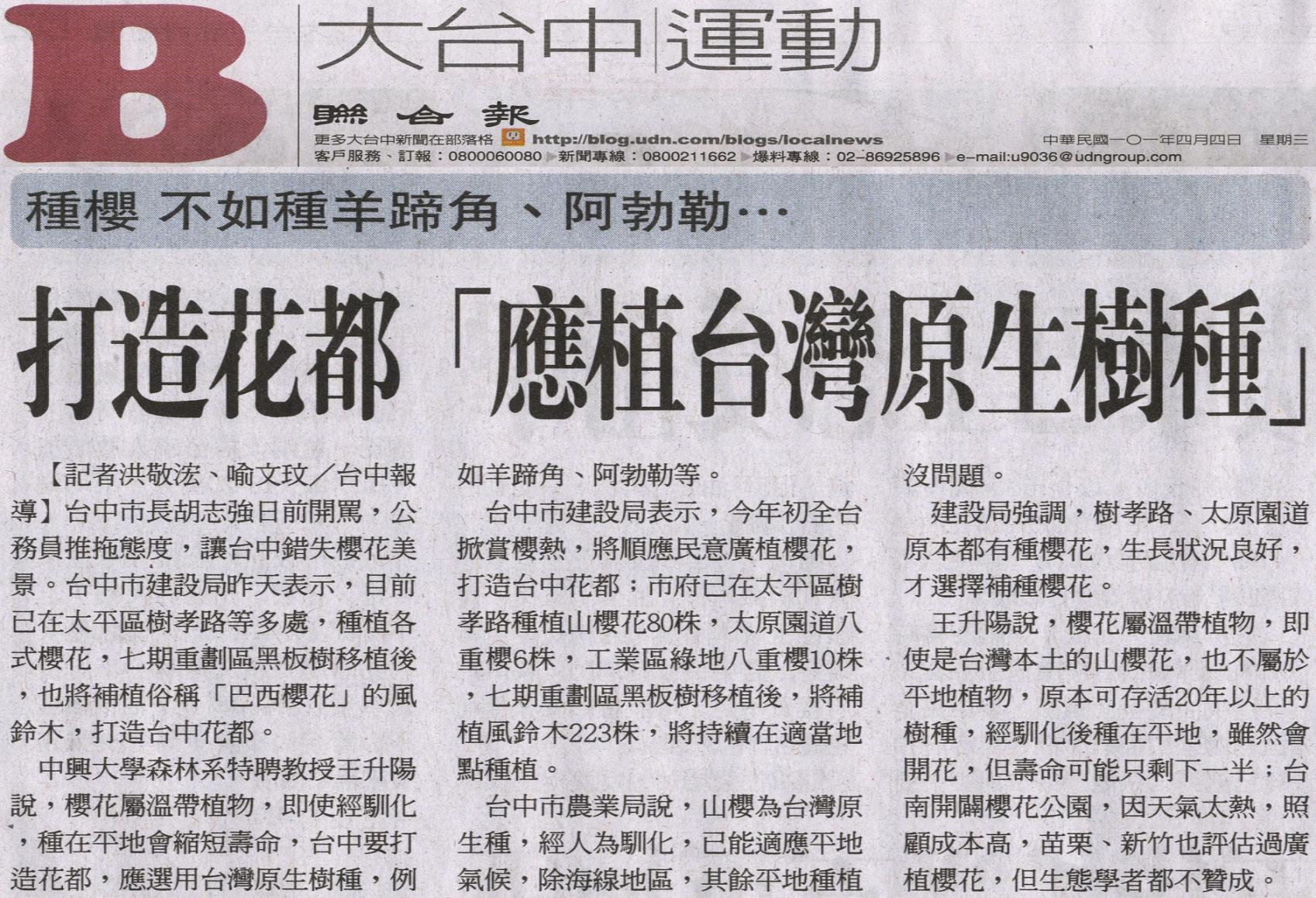中興大學森林系特聘教授王升陽說,櫻花屬溫帶植物,即使經馴化,種在平地會縮短壽命,台中要打造花都,應選用台灣原生樹種,例如羊蹄角、阿勃勒等。