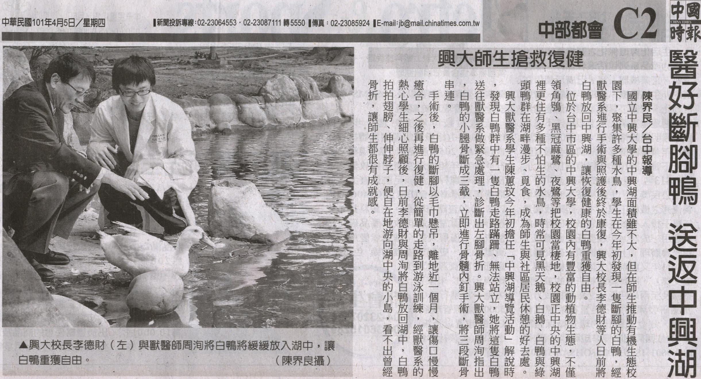 國立中興大學的中興湖面積雖不大,但在師生推動有機生態校園下,聚集許多種水鳥,學生在今年初發現一隻斷腳的白鴨,經獸醫系進行手術與照護後終於康復,興大校長李德財等人日前將白鴨放回中興湖,讓恢復健康的白鴨重獲自由。
