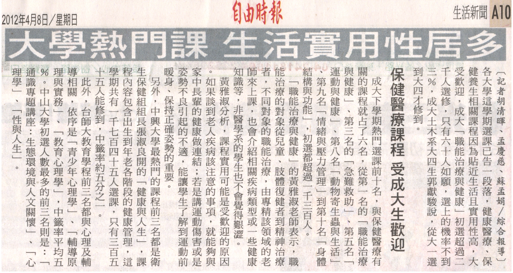 黃雅淑分析,課程實用可能是受歡迎的原因。如果談到老人疾病該注意的事項,就能夠與家中長輩的健康做連結;若是講運動傷害或是姿勢不良引起的不適,能讓學生了解到運動前暖身、保持正確姿勢的重要。